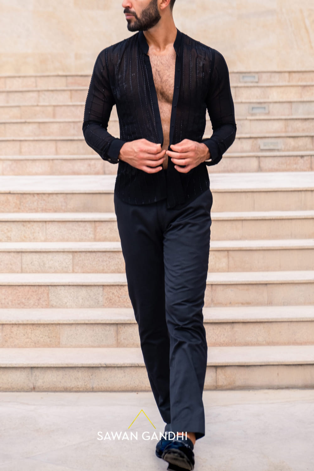 Sawan Gandhi designs this charming shirt in georgette with cutdana embellishment in a stripe pattern. Style it with a jacket for the party. The pants here are shown for styling purposes only.