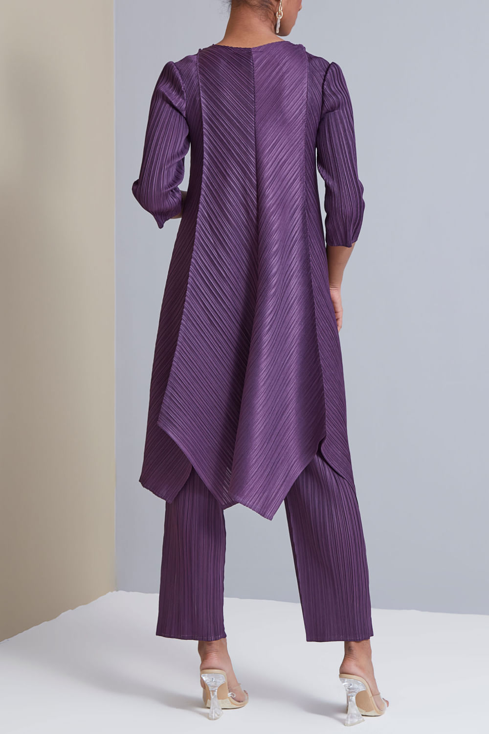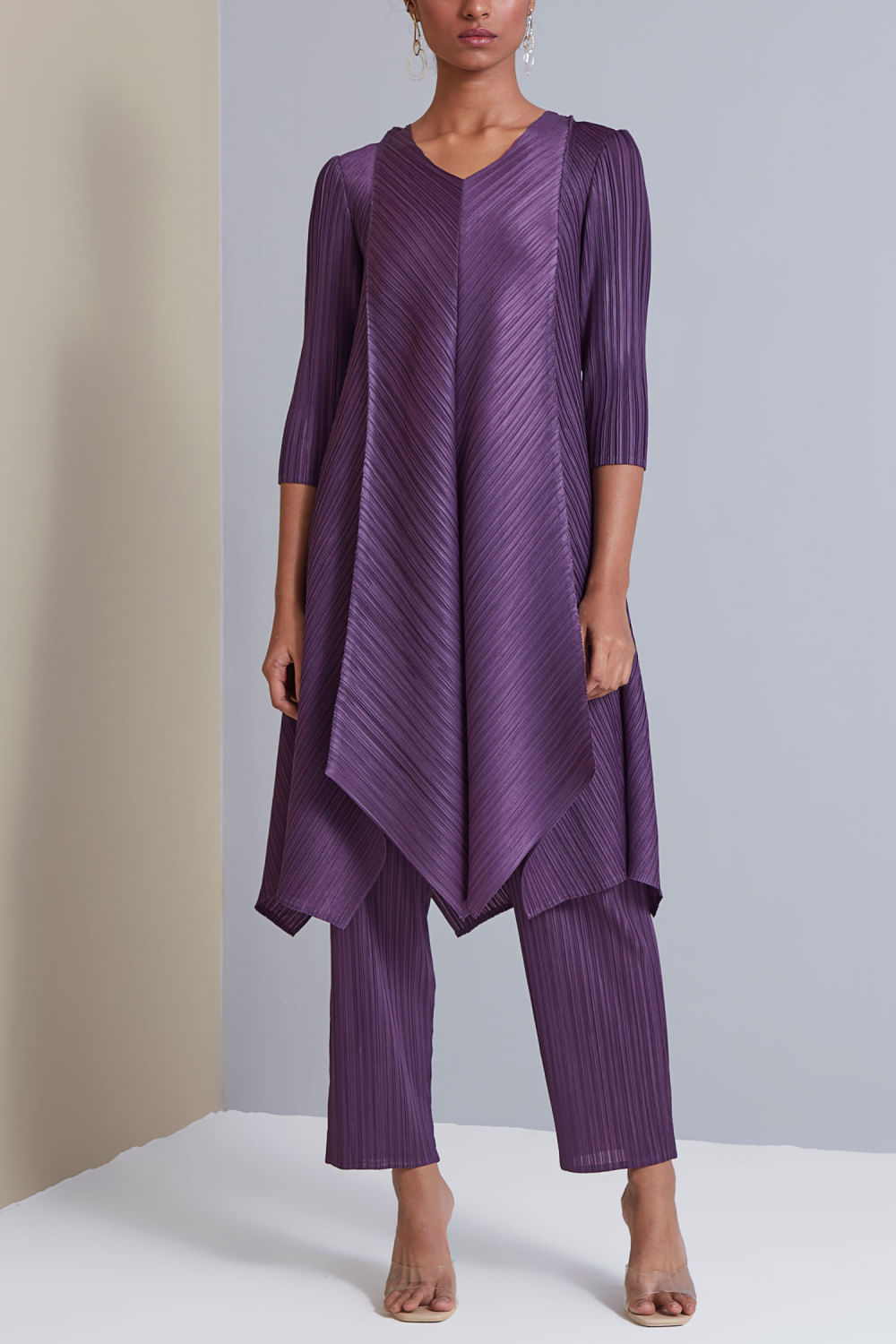 Scarlet Sage designs this versatile V neck top with chevron pleats and hemline, teamed with slim pants. Style the look with gemstone danglers and embroidered juttis.