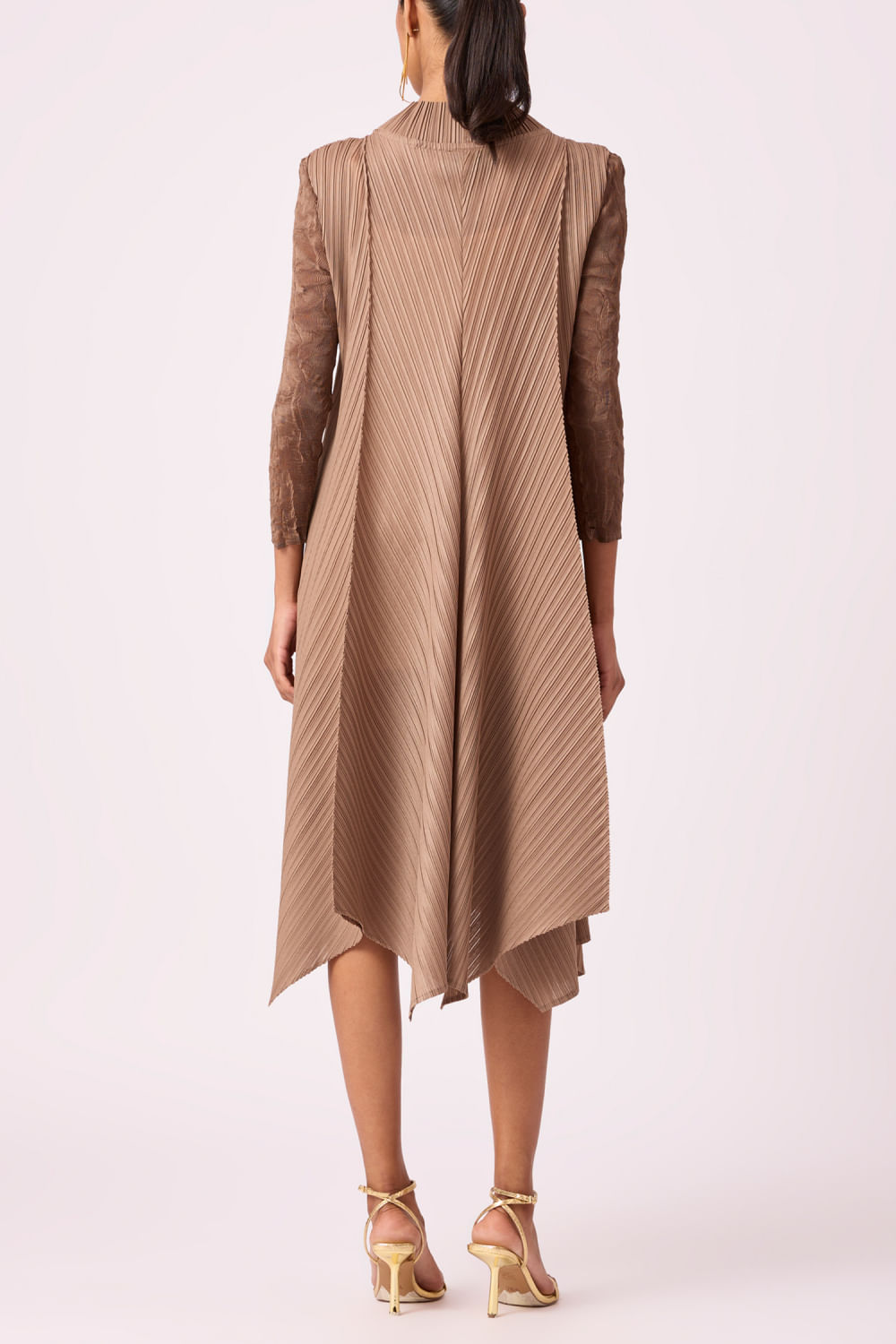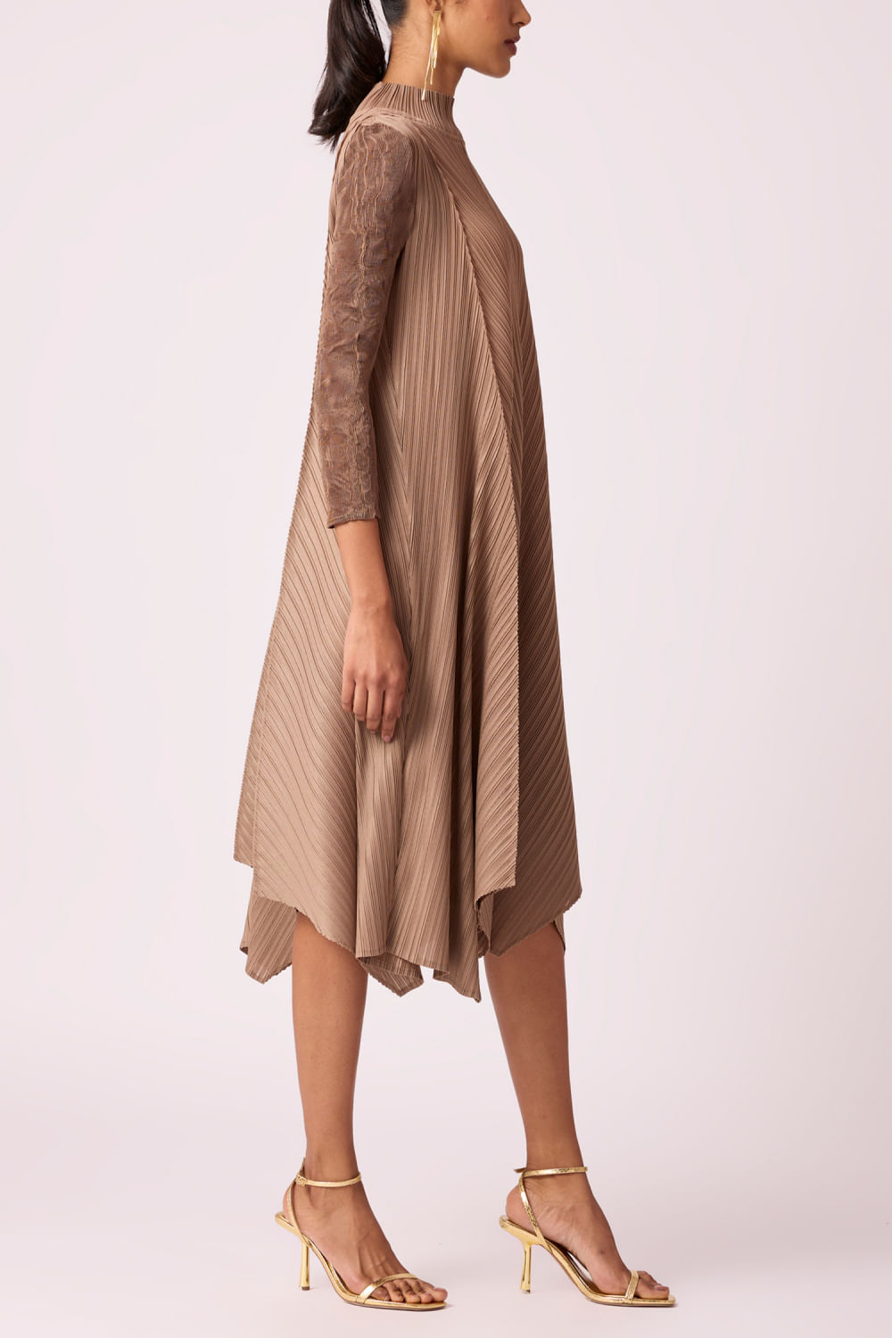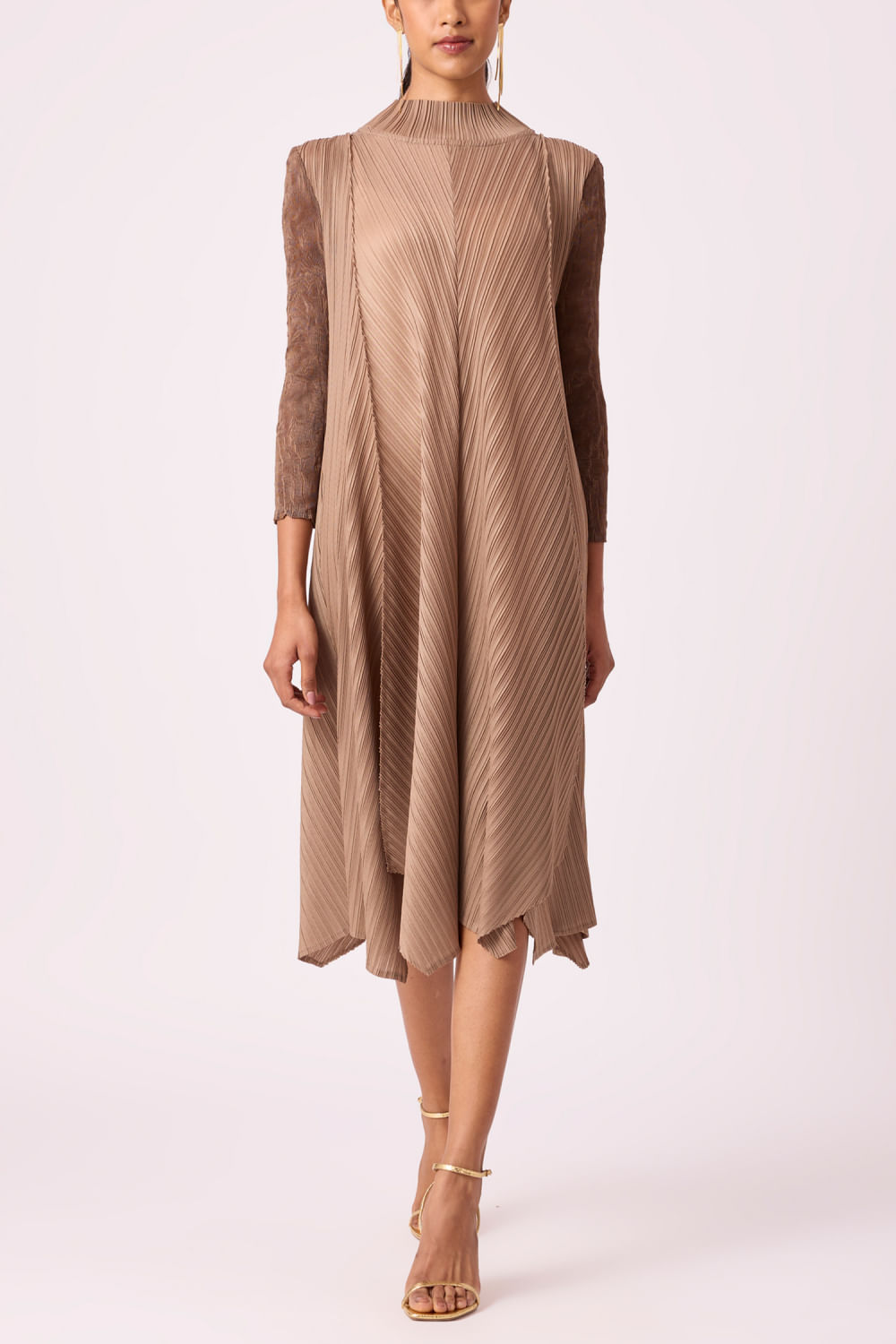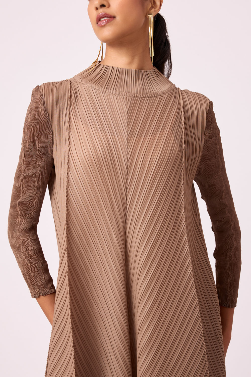 Scarlet Sage designs this graceful dress fabricated in polyester with a high neck, panel cut and fit flared silhouette featuring a micro pleated pattern. Style the look with a pair of sneakers for a chill vibe.
