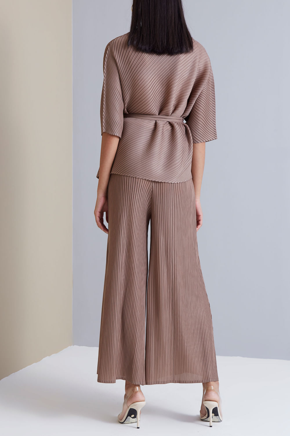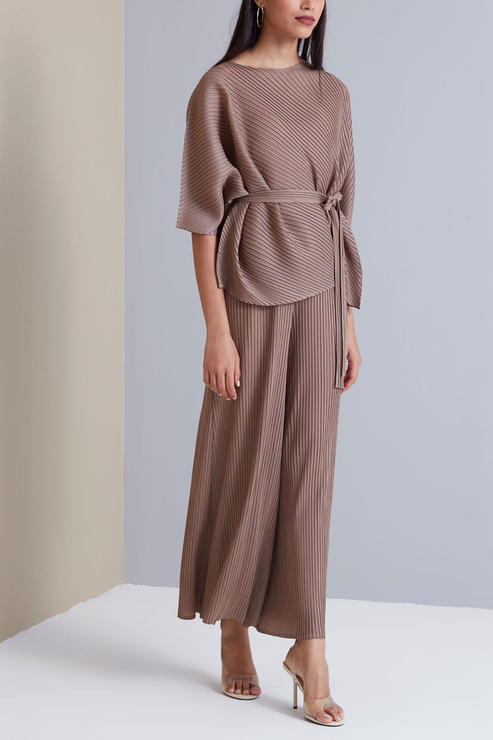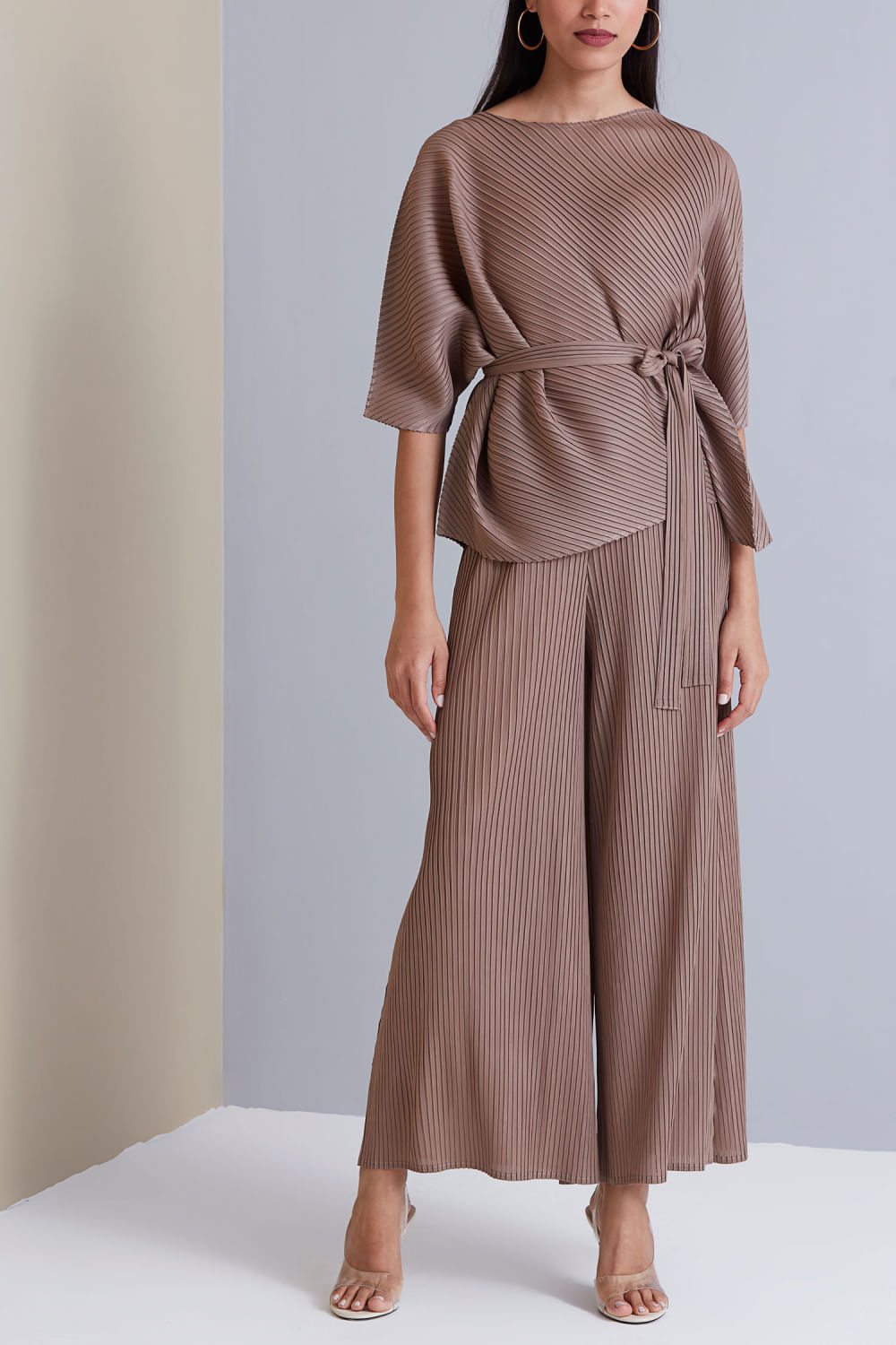 Scarlet Sage designs this uber-stylish asymmetric top in pleated fabric, teaming it with flared pants, accentuating the waist and the belt. Style the look with gemstone earrings and nude peep-toe sandals.