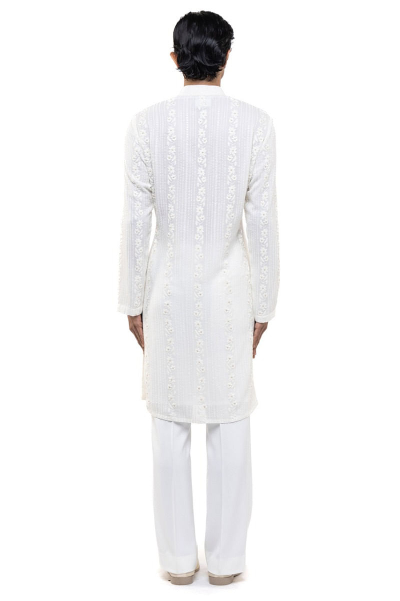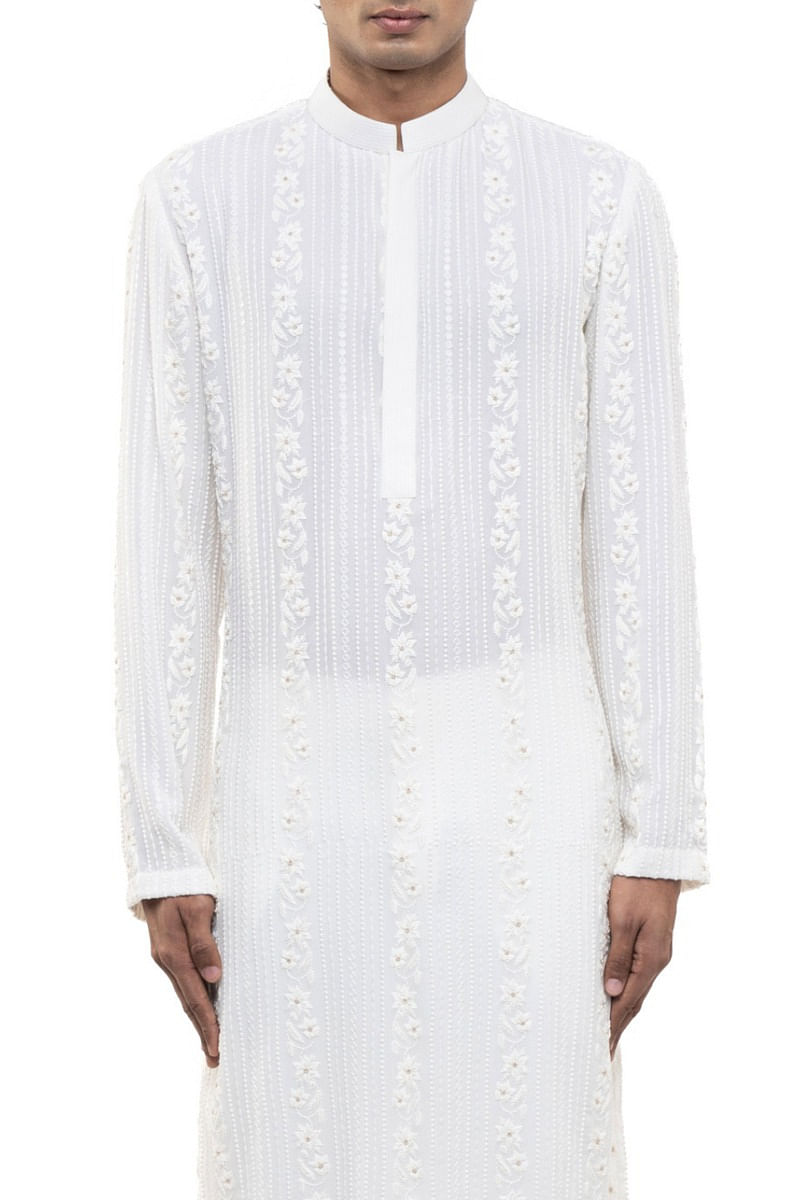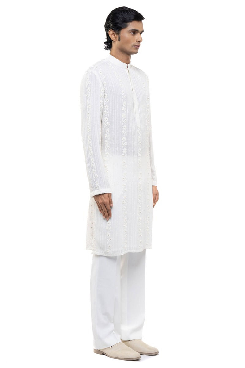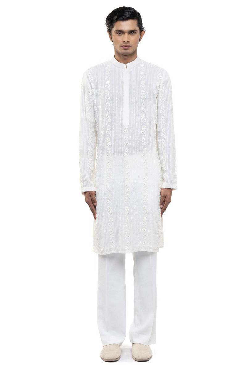 SDS BY KUSHAL SHAH designs this elegant kurta customised in lucknowi georgette with thread and bead work, teaming it with pants. Style the look with Ivory monk strap shoes.