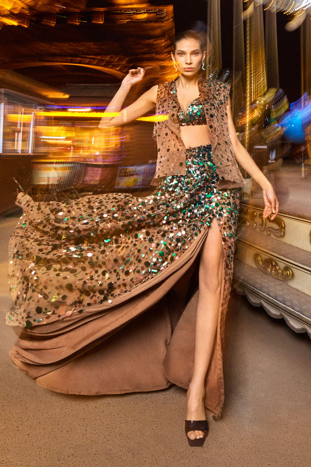 Seema Gujral designs this dazzling strappy blouse and slit skirt in net enriched with sequins in cascading patterns, teamed with a matching embellished organza short jacket. Style the look with an emerald embellished necklace set and an embellished bracelet for an impeccable appearance.