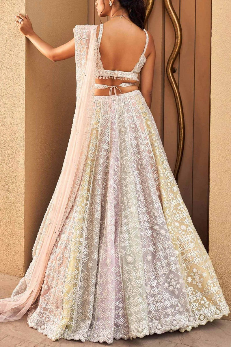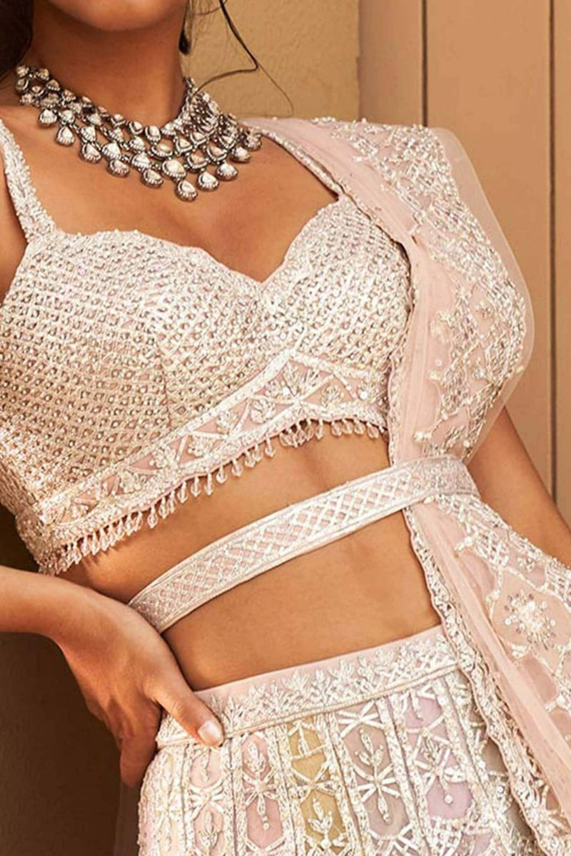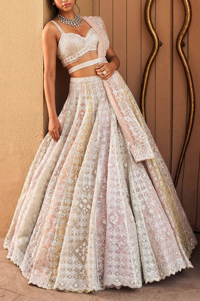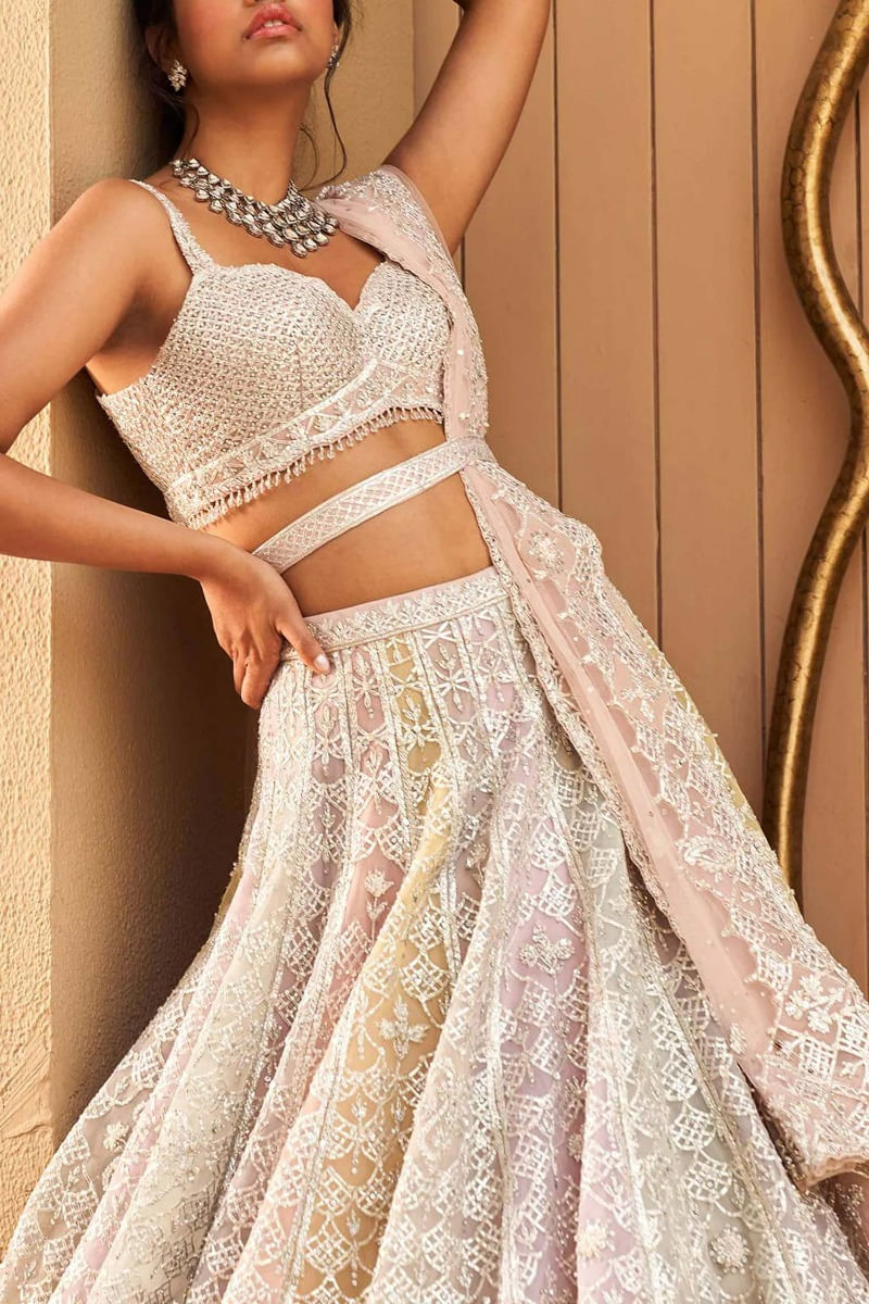 Seema Gujral designs this modern bridal lehenga with metallic silver embroidery all over its panels, teamed with an embellished bustier, dupatta and belt. Style the look with a second dupatta and heirloom pearls for the big day.