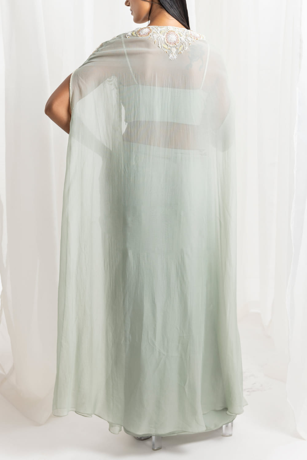 Seema Thukral designs this dramatic cape embraced in organza with applique work, pearls, sequins and cutdana detailing in floral patterns, teaming it with a matching embellished strappy georgette blouse and a matching draped georgette skirt. Style the look with holographic wedges and an embellished clutch for a stunning impression.