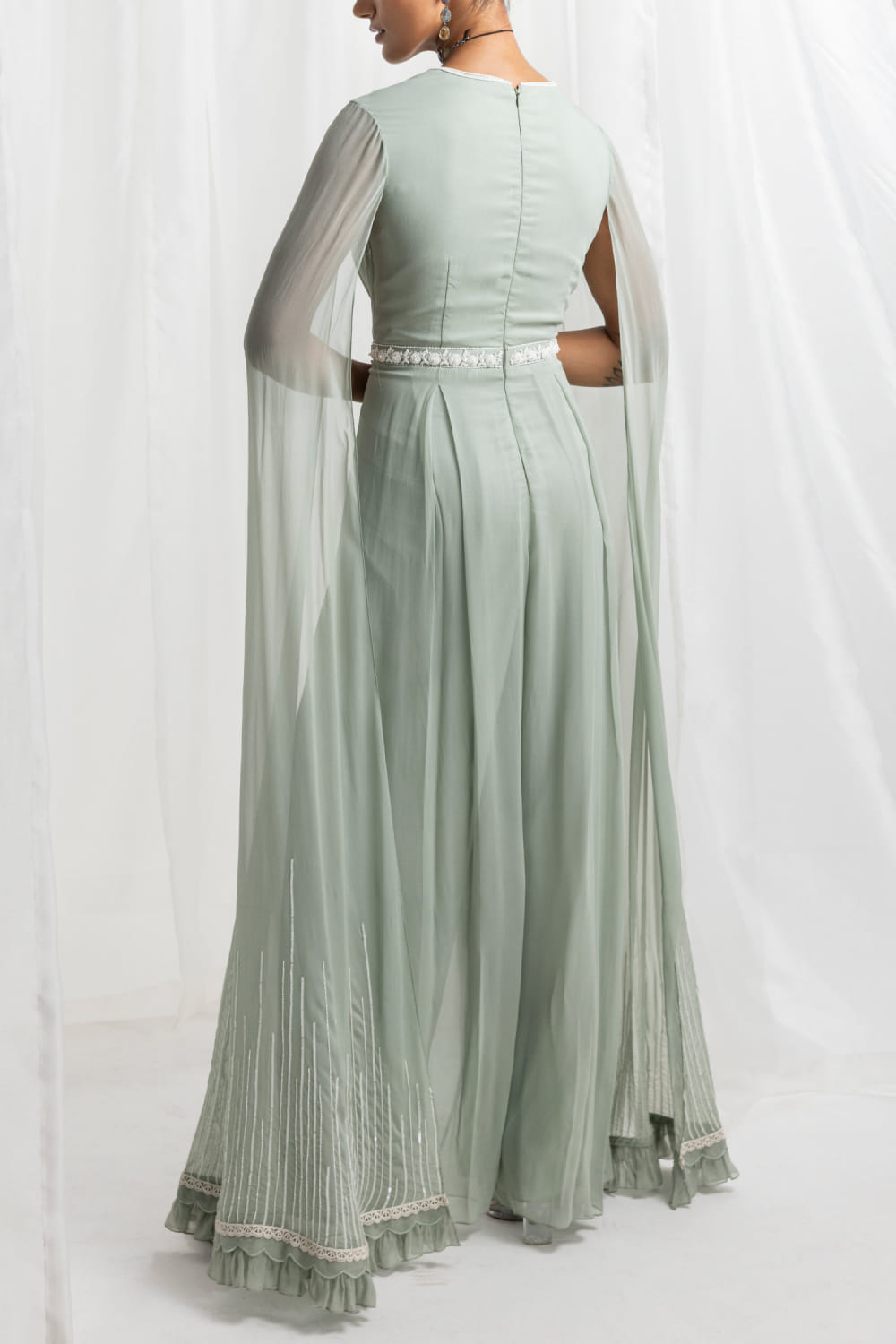 Seema Thukral designs this opulent jumpsuit customised in georgette with pleated detailing, pearls, sequins, cutdana and white bead embellishments featuring ruffles and scallop patterns on the cape sleeves. Style the look with an embellished choker set and an embellished clutch to stun the crowd.
