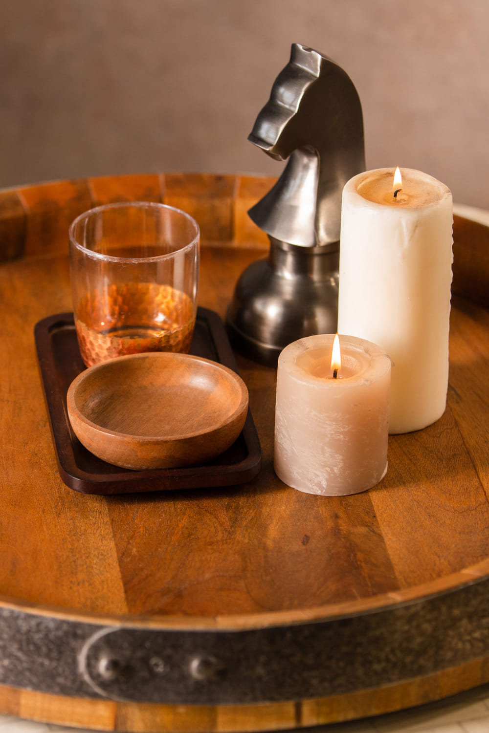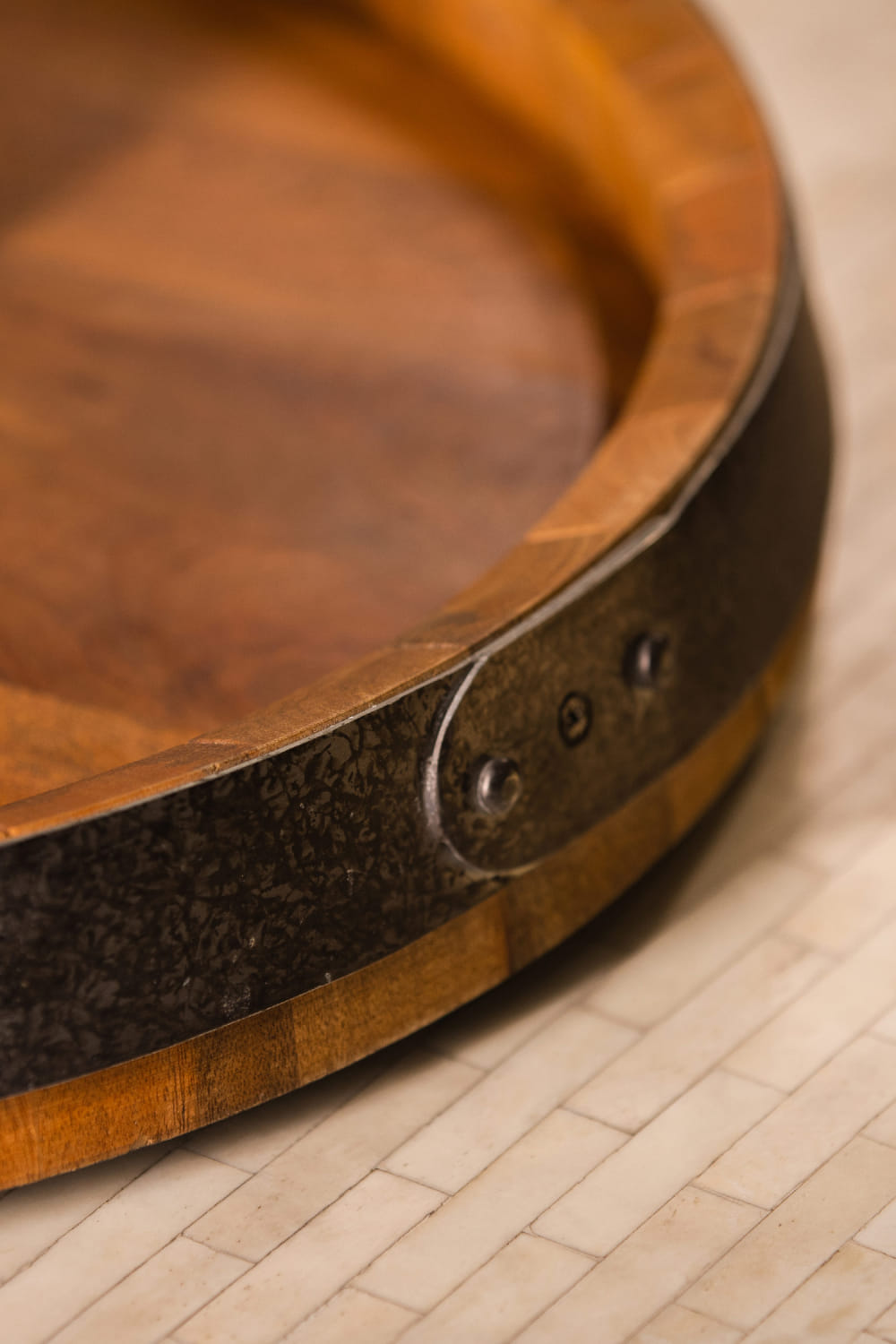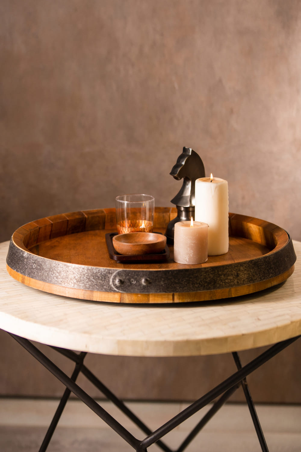 S.G Home designs this outstanding revolving tray crafted in wood and metal. Reserve it for an alfresco supper.