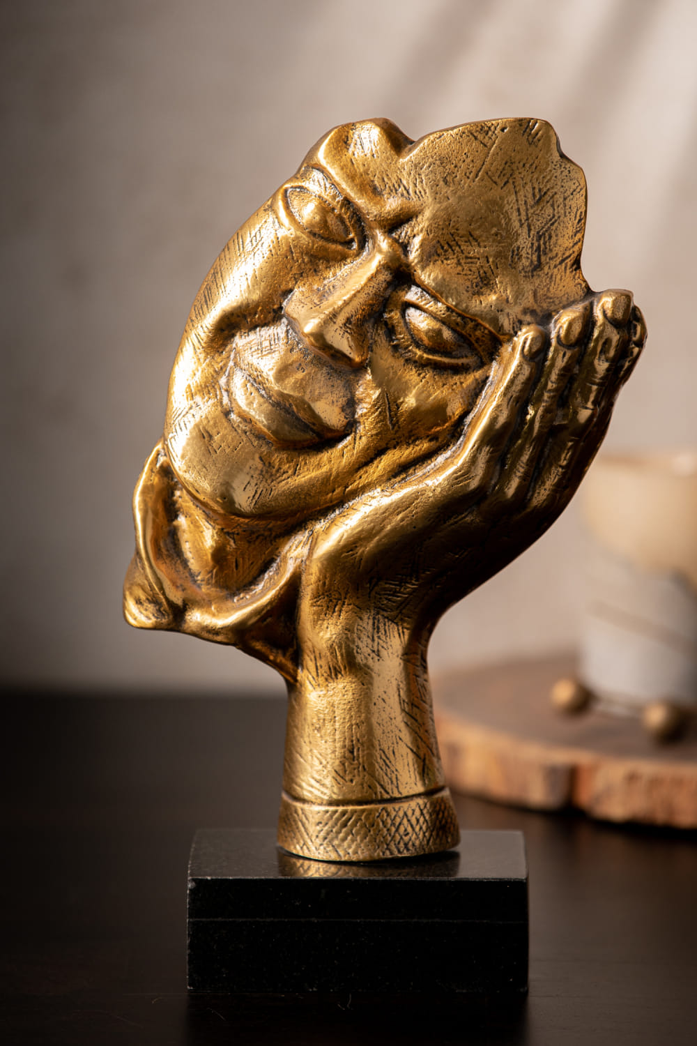 S.G Home designs this elegant decor customised in metal and marble with a face resting on a hand shape featuring an antique finish. Exhibit it on your table for an aesthetic appeal.
