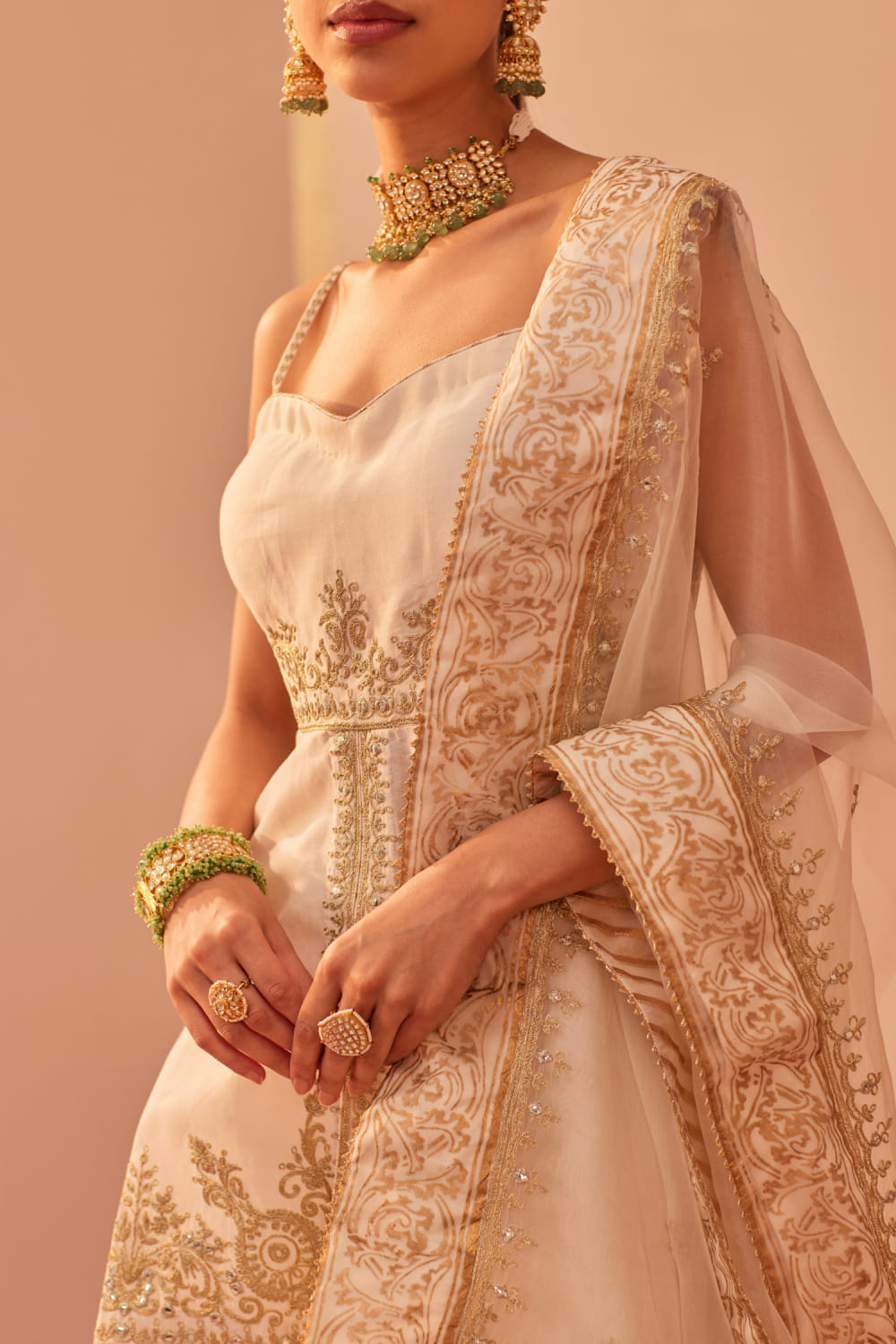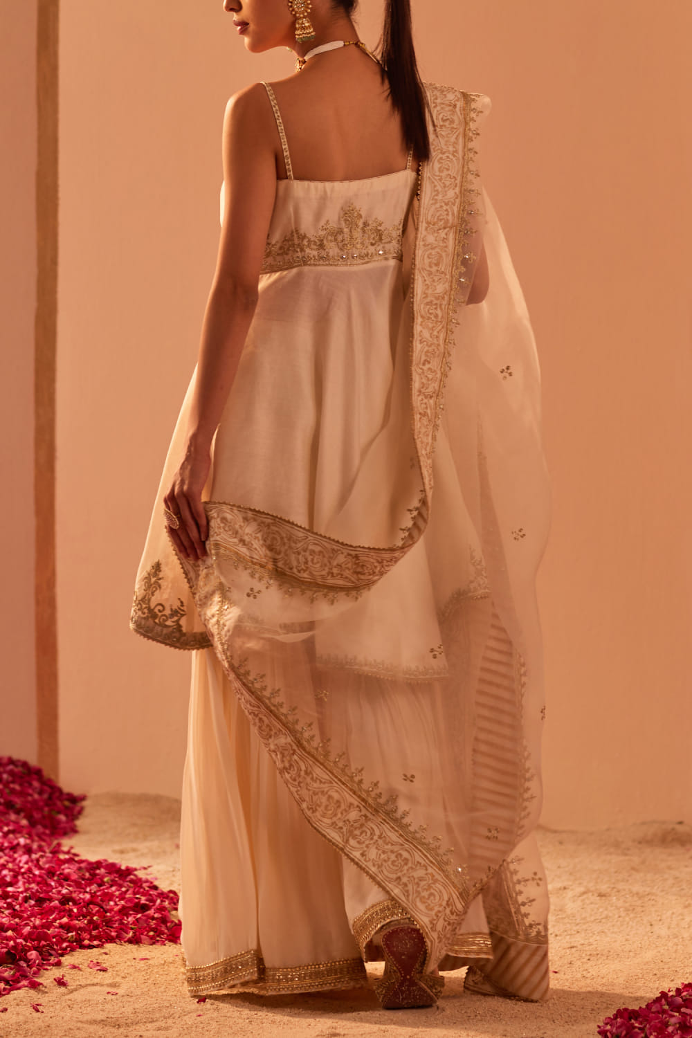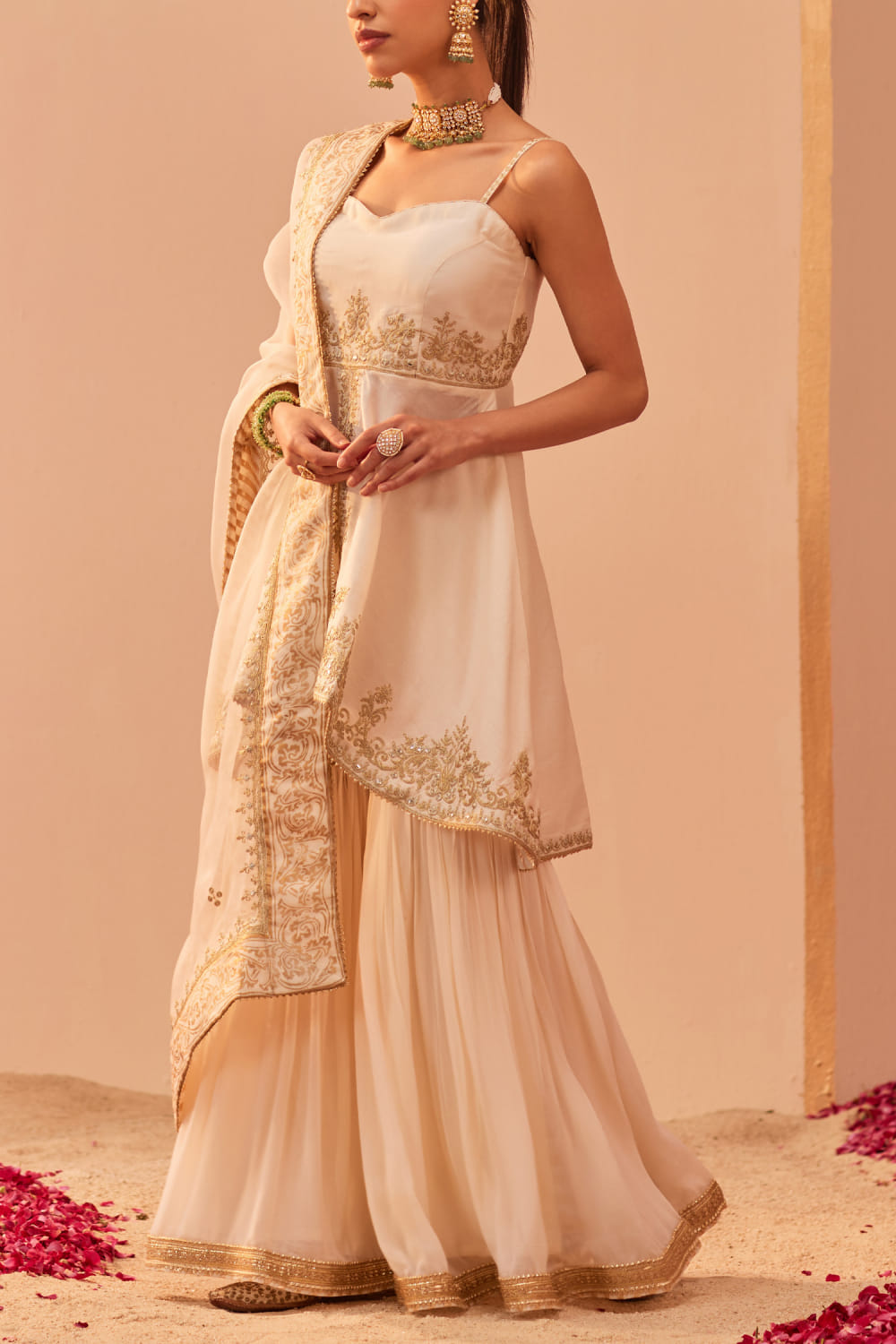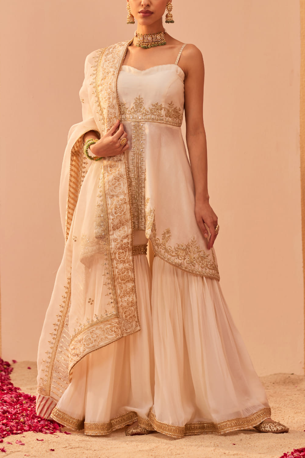 Sheetal Batra designs this opulent strappy and short high-low kurta embraced in silk chanderi with tilla and patra embroidery over block prints featuring delicate shining highlights and gota trims, pairing it with a matching embroidered georgette gharara and matching embroidered and printed silk organza dupatta. Style the look with polki embellished jhumkas and kolhapuri wedges for a pre-wedding affair.