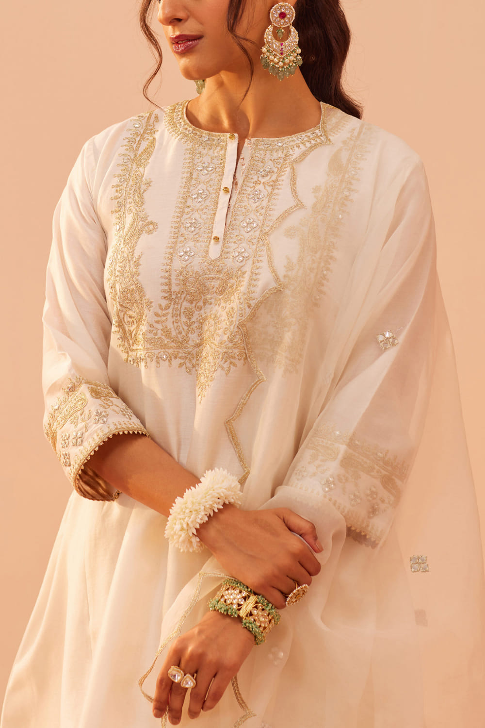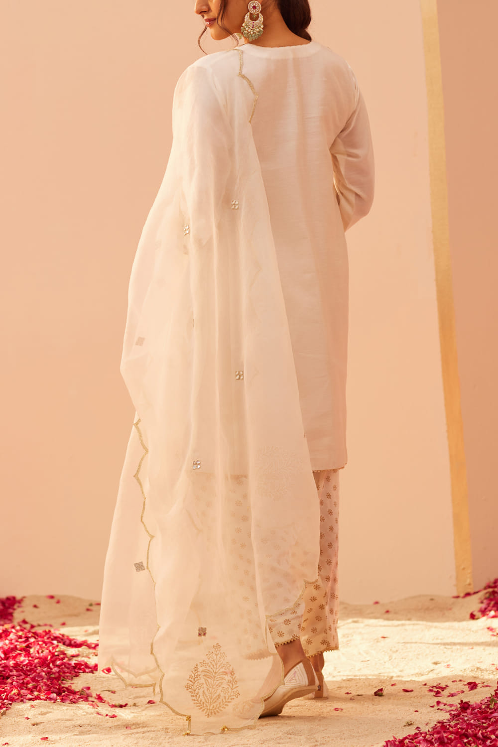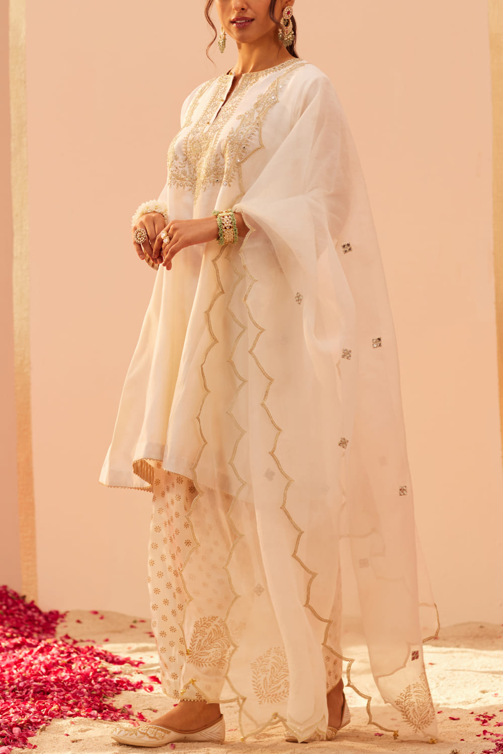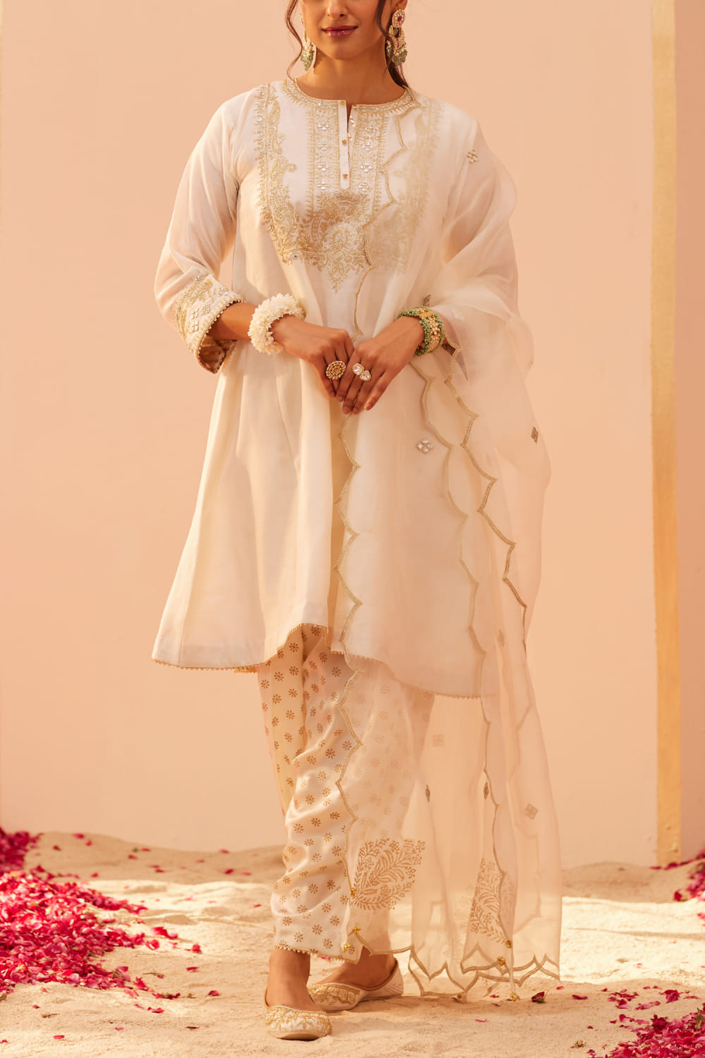 Sheetal Batra designs this glamorous short kurta in silk chanderi enriched with tilla and patra embroidery over block prints featuring delicate mirror highlights and gota trims, complementing it with a matching printed bemberg satin salwar and matching printed and embroidered silk organza dupatta. Style the look with embellished danglers and mule block heels.