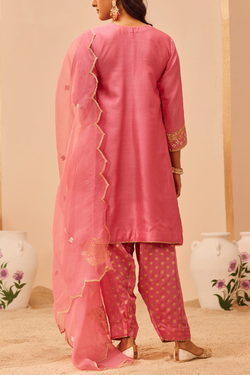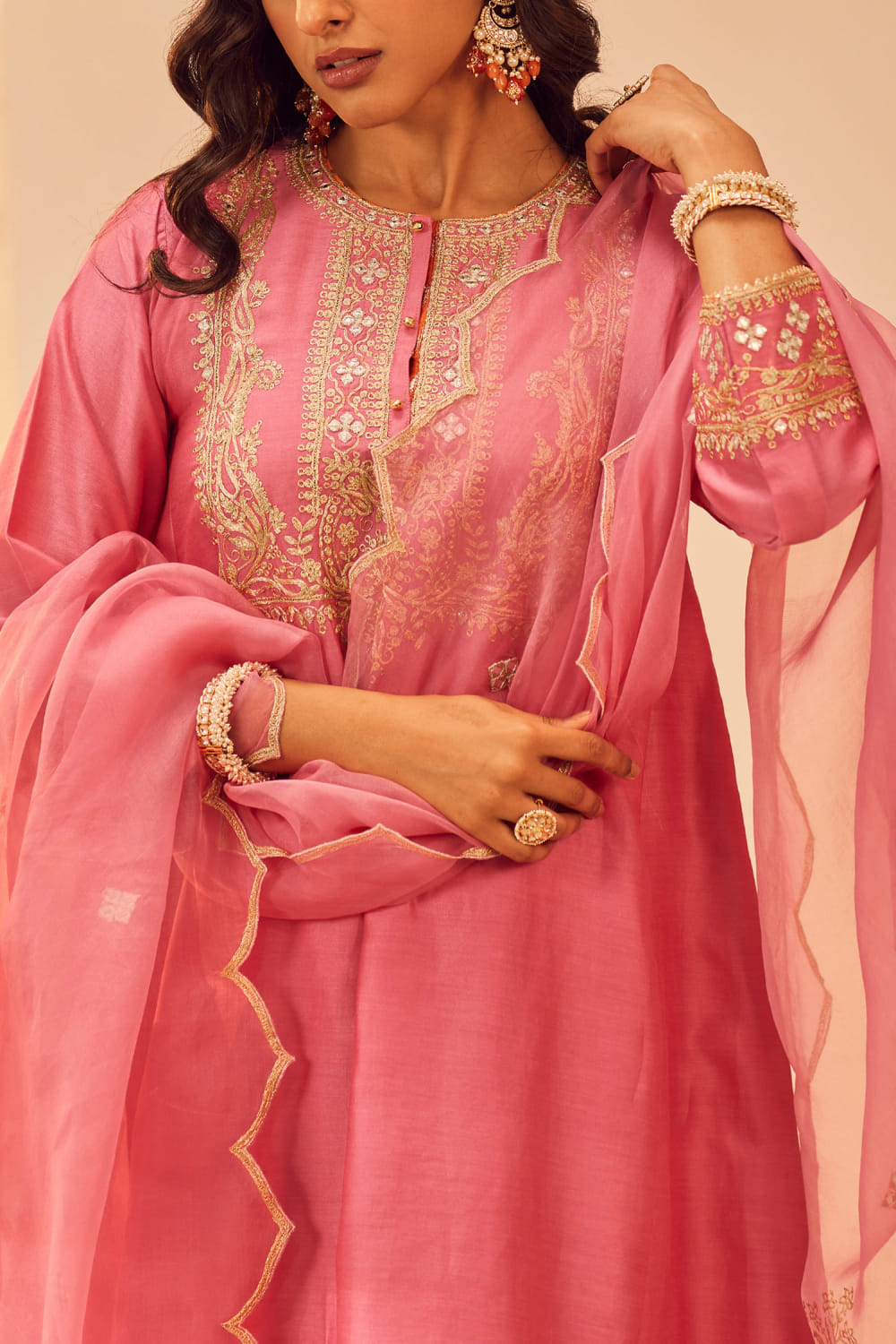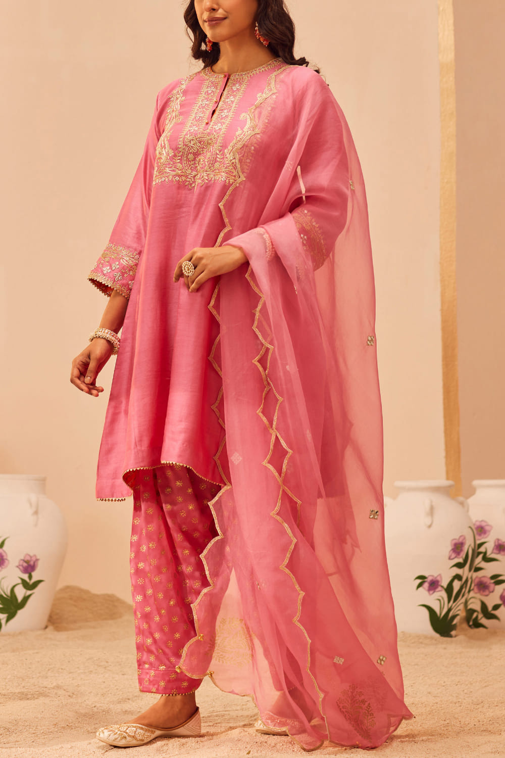 Sheetal Batra designs this admirable short kurta in silk chanderi crafted with tilla and patra embroidery over block prints featuring delicate mirror highlights and gota trims, teaming it with a matching printed bemberg satin salwar and matching printed and embroidered silk organza dupatta. Style the look with polki embellished earrings and embroidered juttis for a wedding affair.