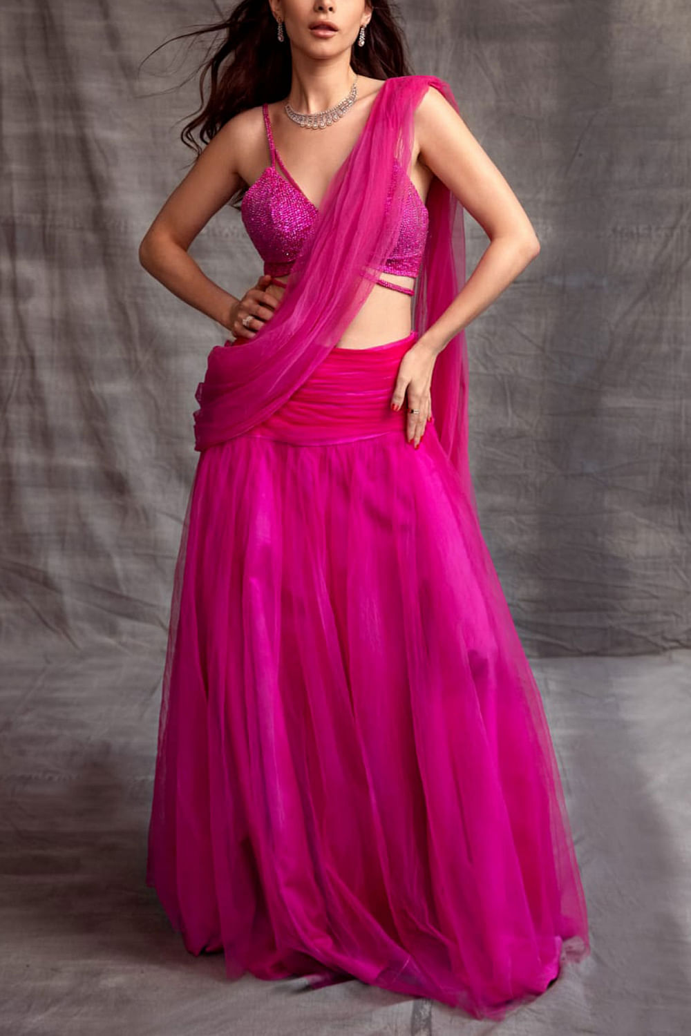 Shehla Khan designs this pre-stitched tulle lehenga sari, pairing it with a bralette blouse featuring crystal embellishments. Style the look with a maang tikka and stackable bangles for a statement look.