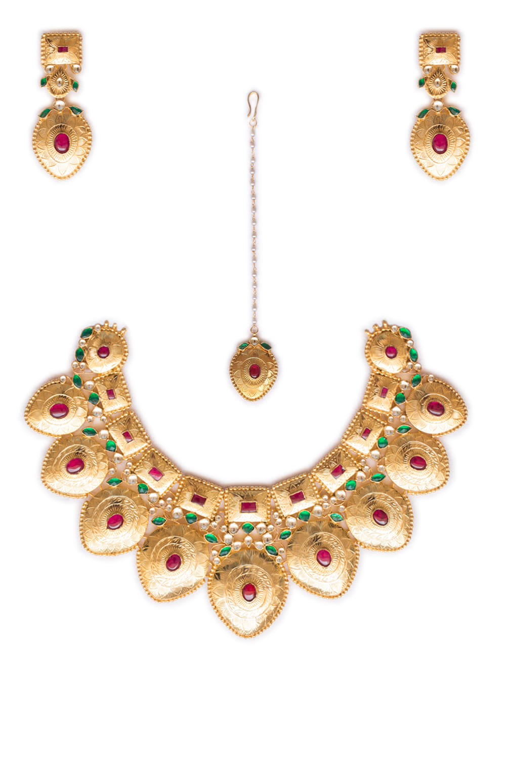 Shlok Jewels design a traditional necklace and earrings set crafted with real imitation stones, featuring ruby stone in the centre and pearl hangings. Style the pieces with a culturally-rooted look.