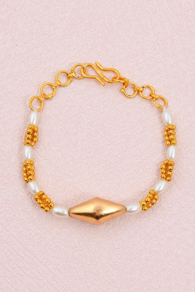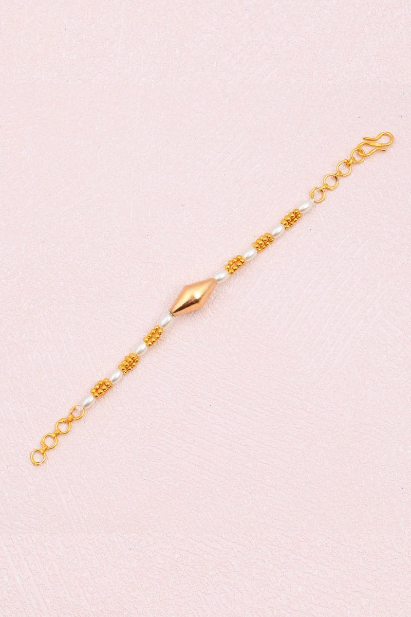 Shlok Jewels designs this delicate rakhi with pearls and gold plated beads.