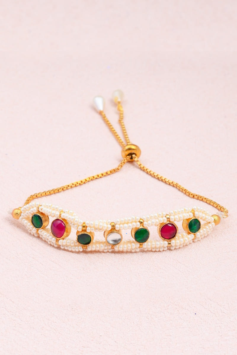 Shlok Jewels designs this adjustable rakhi enriched with pearls and colourful Navratna gemstones.