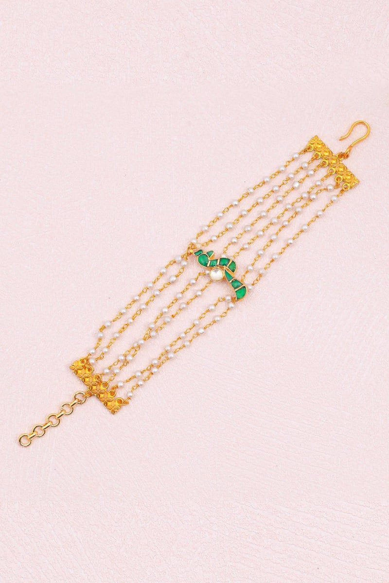 Shlok Jewels designs this special rakhi with strings of pearls and semi-precious stones. It is customised with a chain closure.