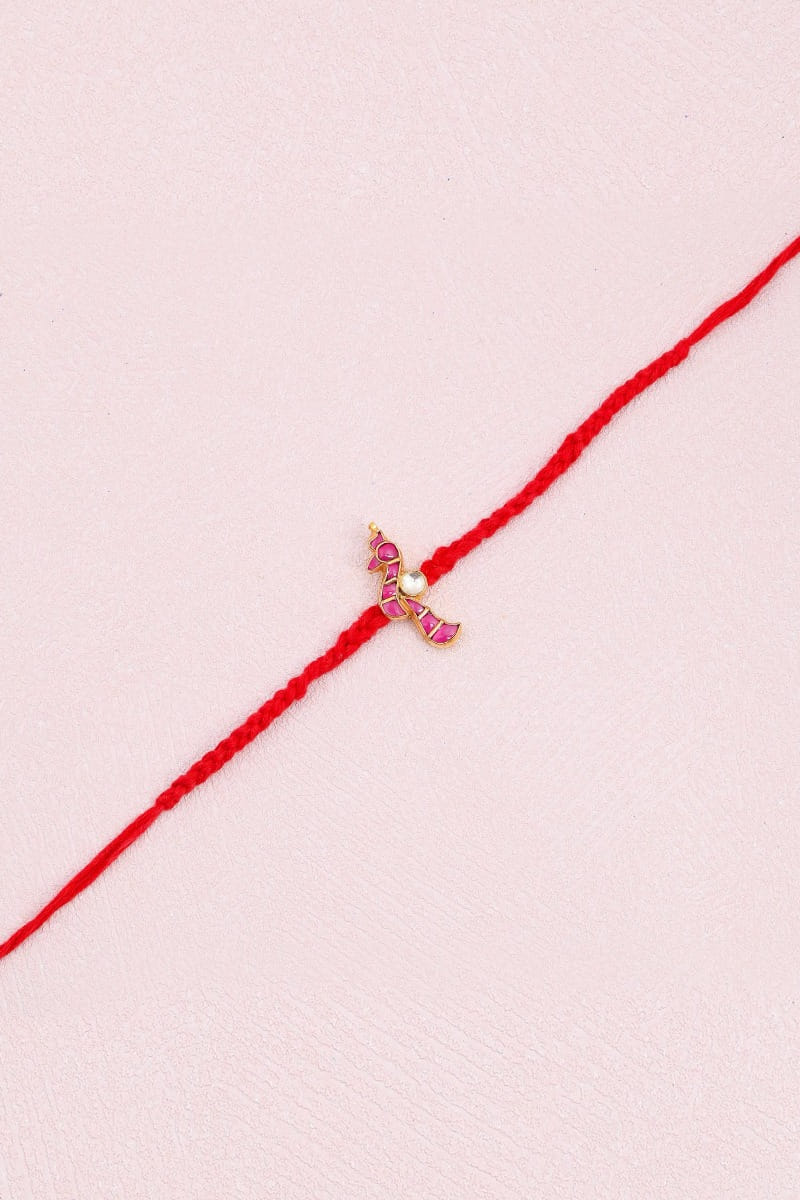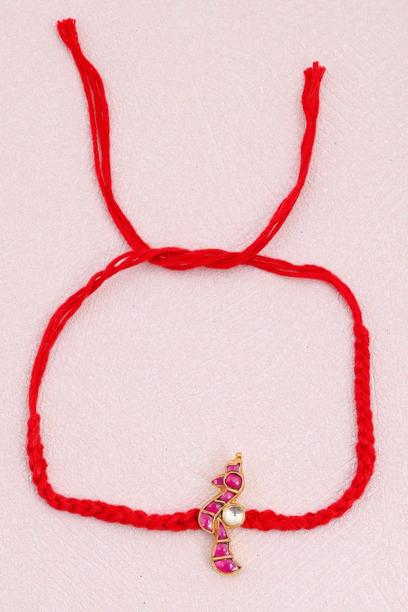 Shlok Jewels designs this simple rakhi with traditional red resham thread and a kundan piece.