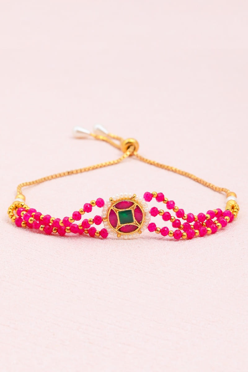 Shlok Jewels designs this culturally-enriched rakhi with strings of gemstones, featuring a kundan embellished centrepiece. It is customised with an adjustable tie-up.