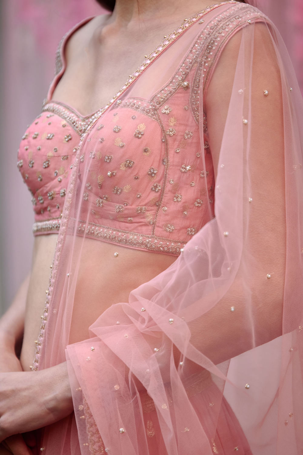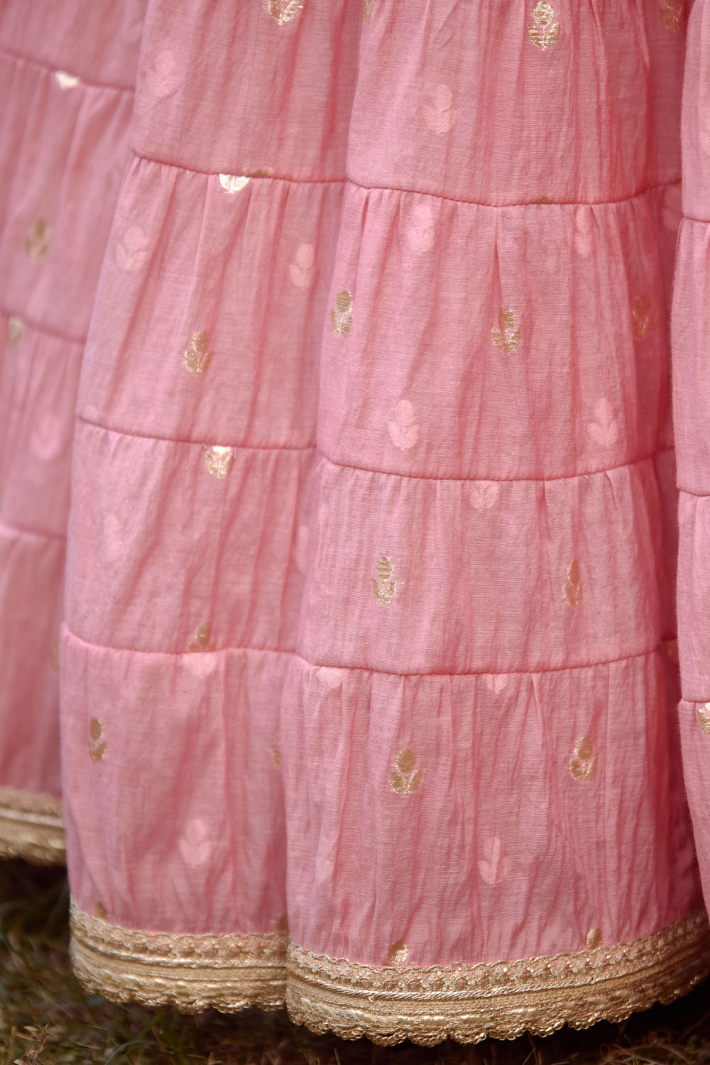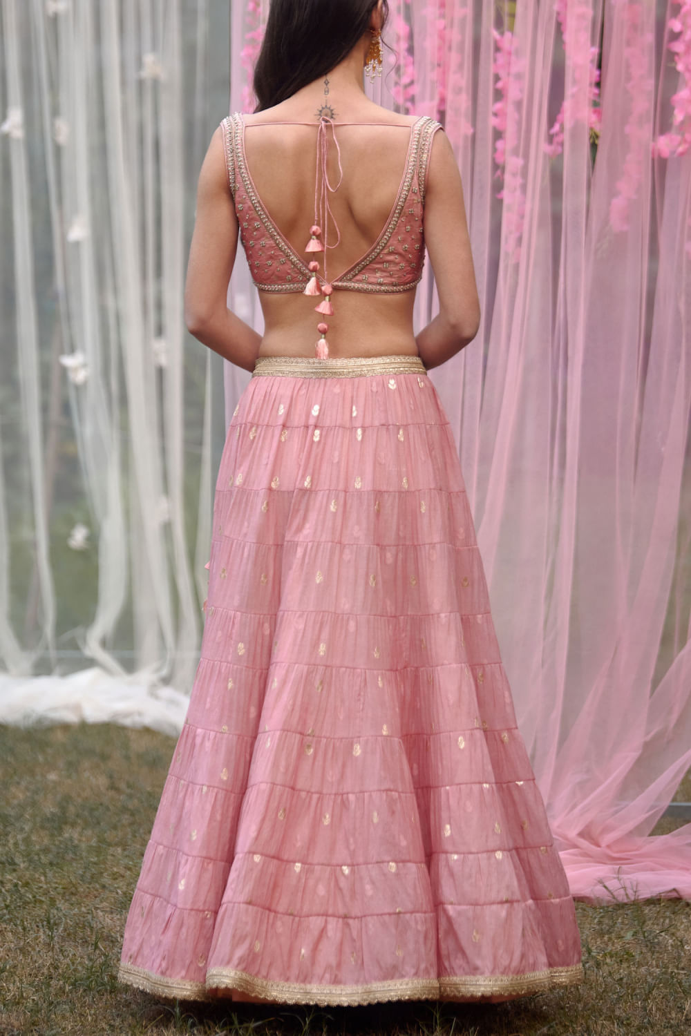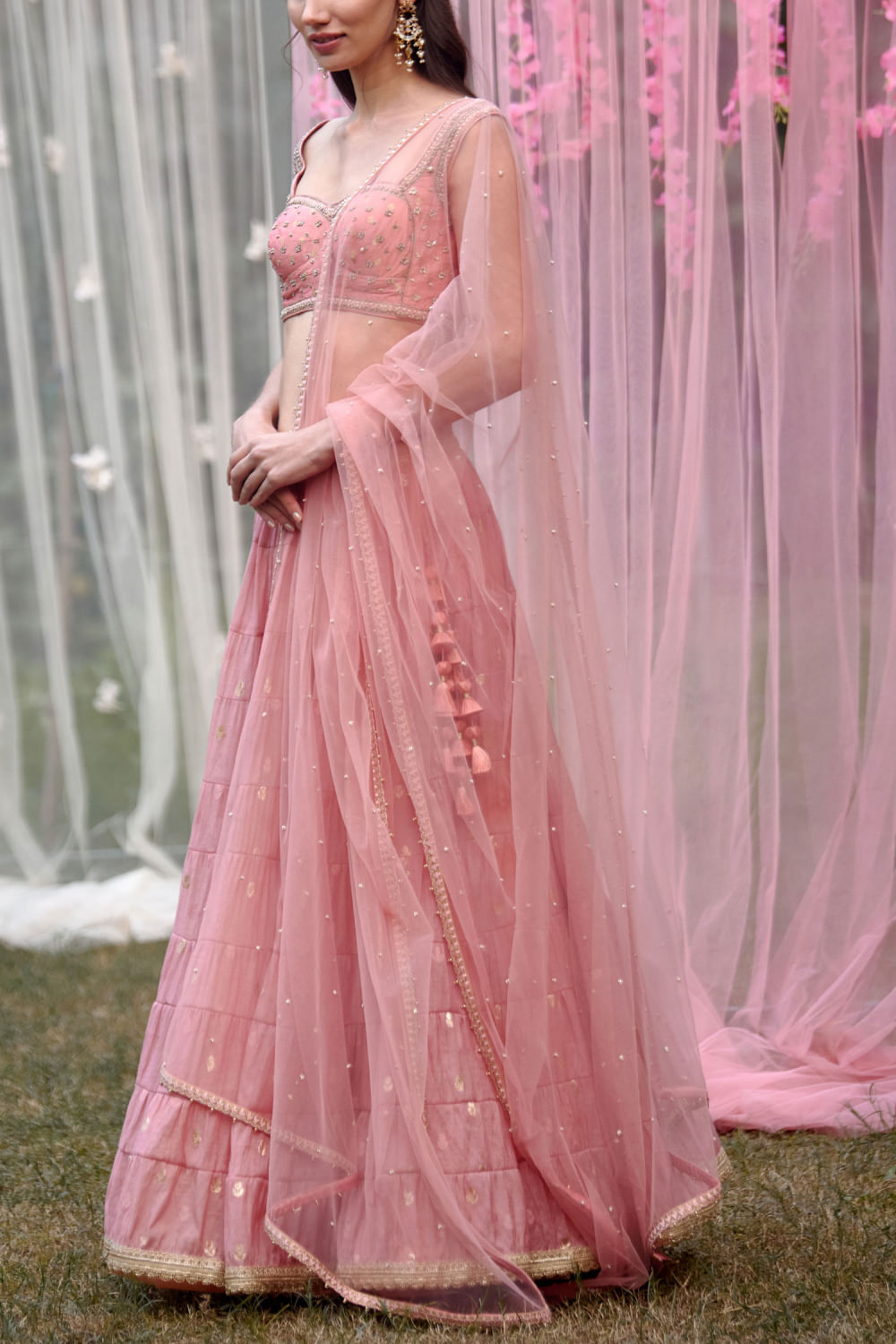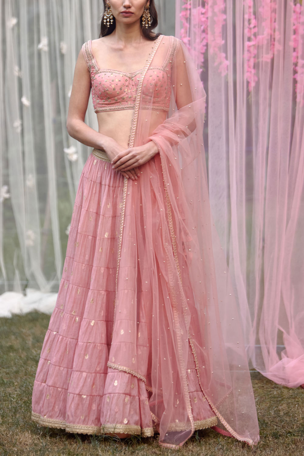 Shyam Narayan Prasad designs this new-age multi-tiered lehenga crafted in chanderi brocade featuring floral motifs, complementing it with a zardozi embroidered sleeveless blouse and sheer net dupatta. Adorn the look with an embellished maang tikka and embellished chandbaalis for a mehendi ceremony.