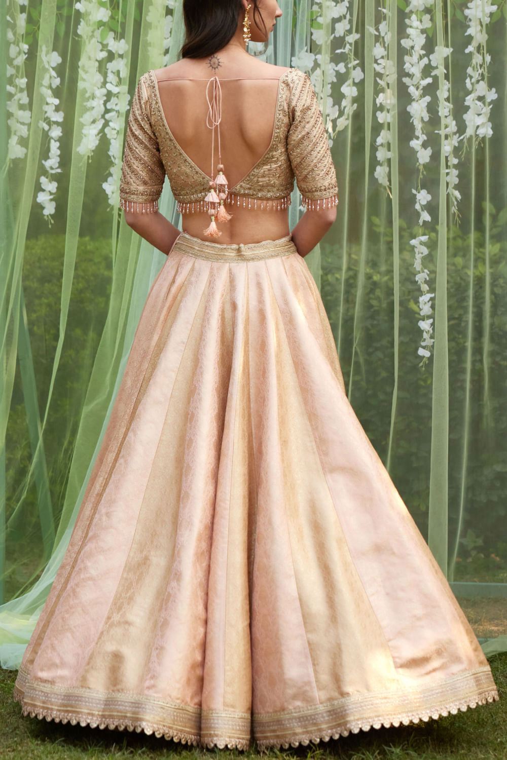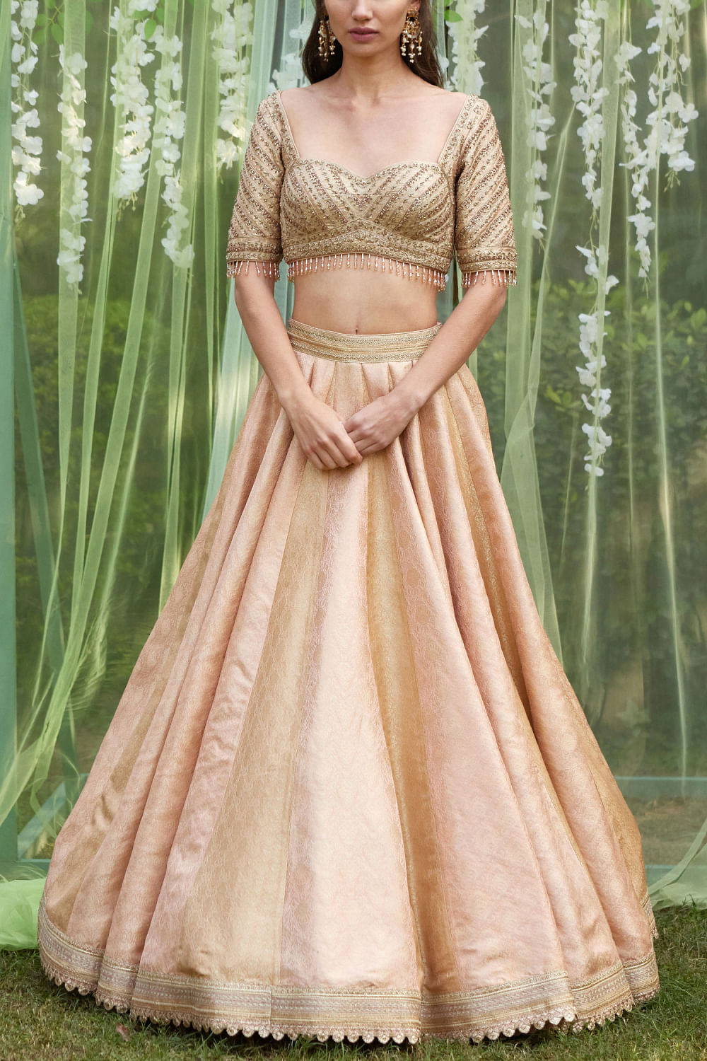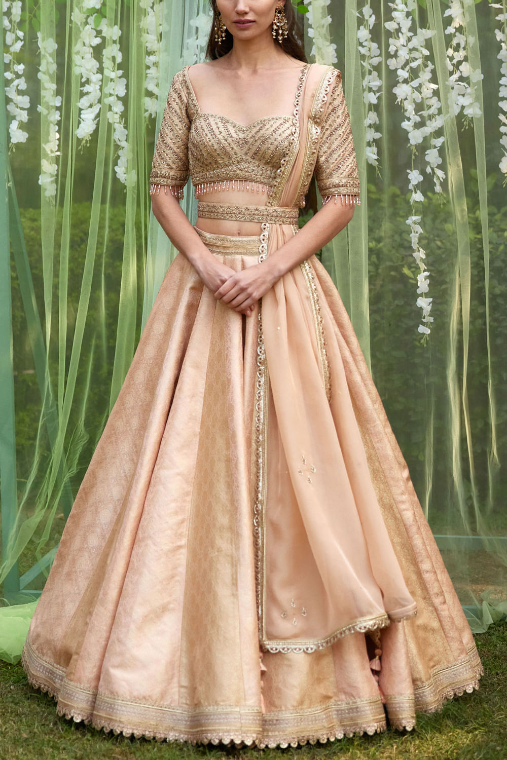 Shyam Narayan Prasad designs a glamorous look with this multicoloured brocade lehenga teamed with a zardozi embroidered tasselled blouse, embroidered organza dupatta and embroidered belt. Style the look with a kundan choker set and metallic stilettos for a festive update.