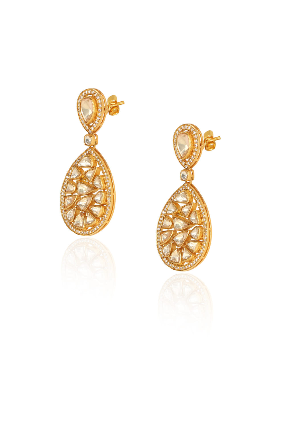 Sica Jewellery designs this pair of artsy drop earrings customised in gold-finished silver, featuring moissanite polki embellishments. Style them with a pastel lehenga ensemble to make a statement.
