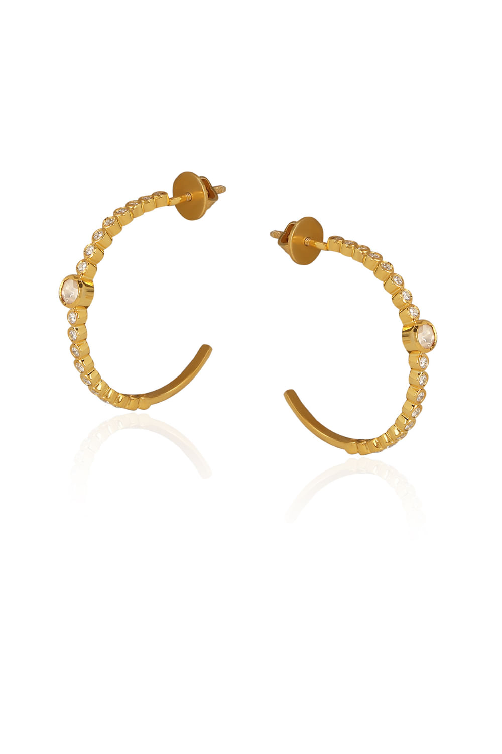 Sica Jewellery designs this pair of versatile hoops customised in gold finish 925 silver, featuring moissanite polki embellishments. Style them with a handwoven sari or a printed kurta to make a statement.