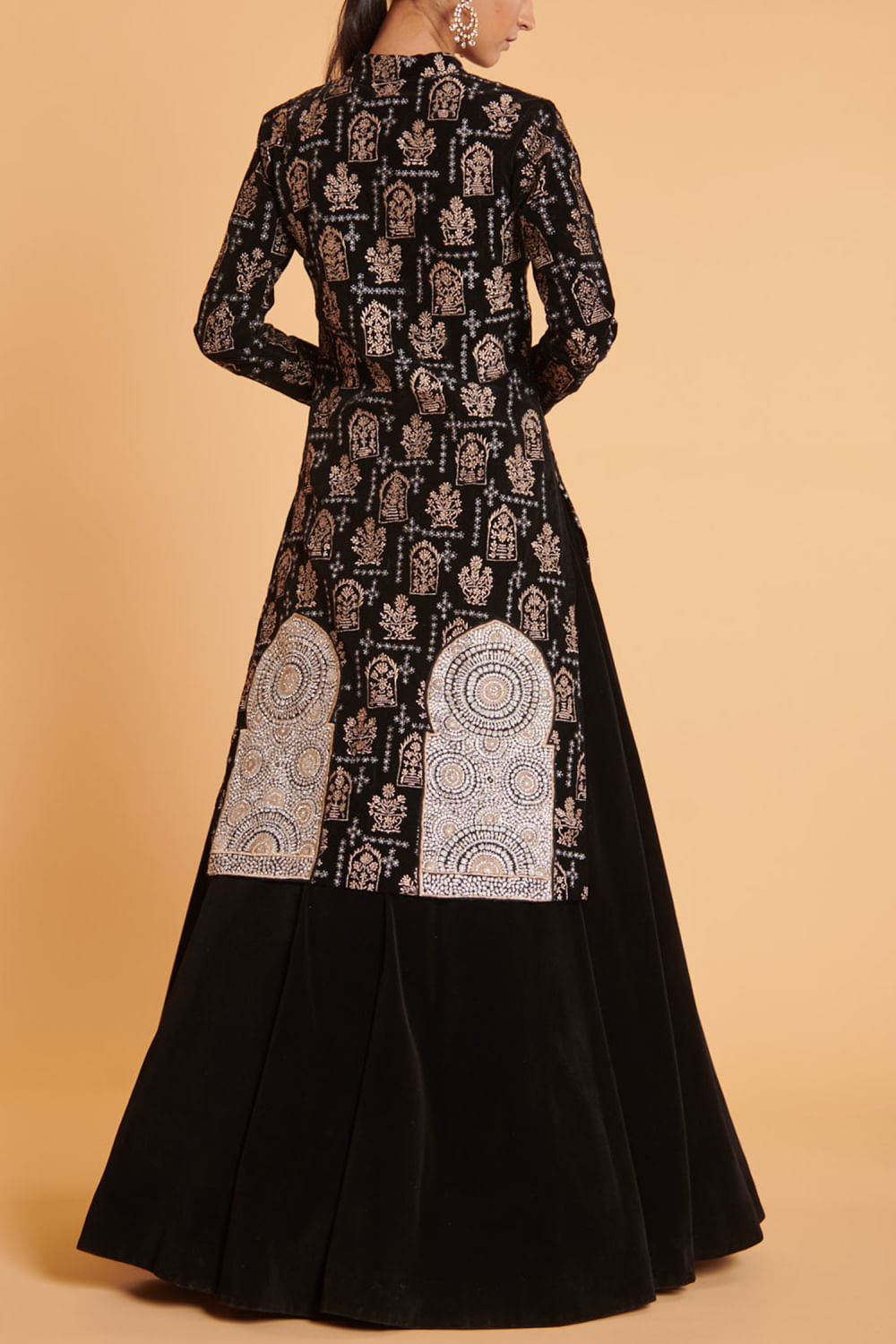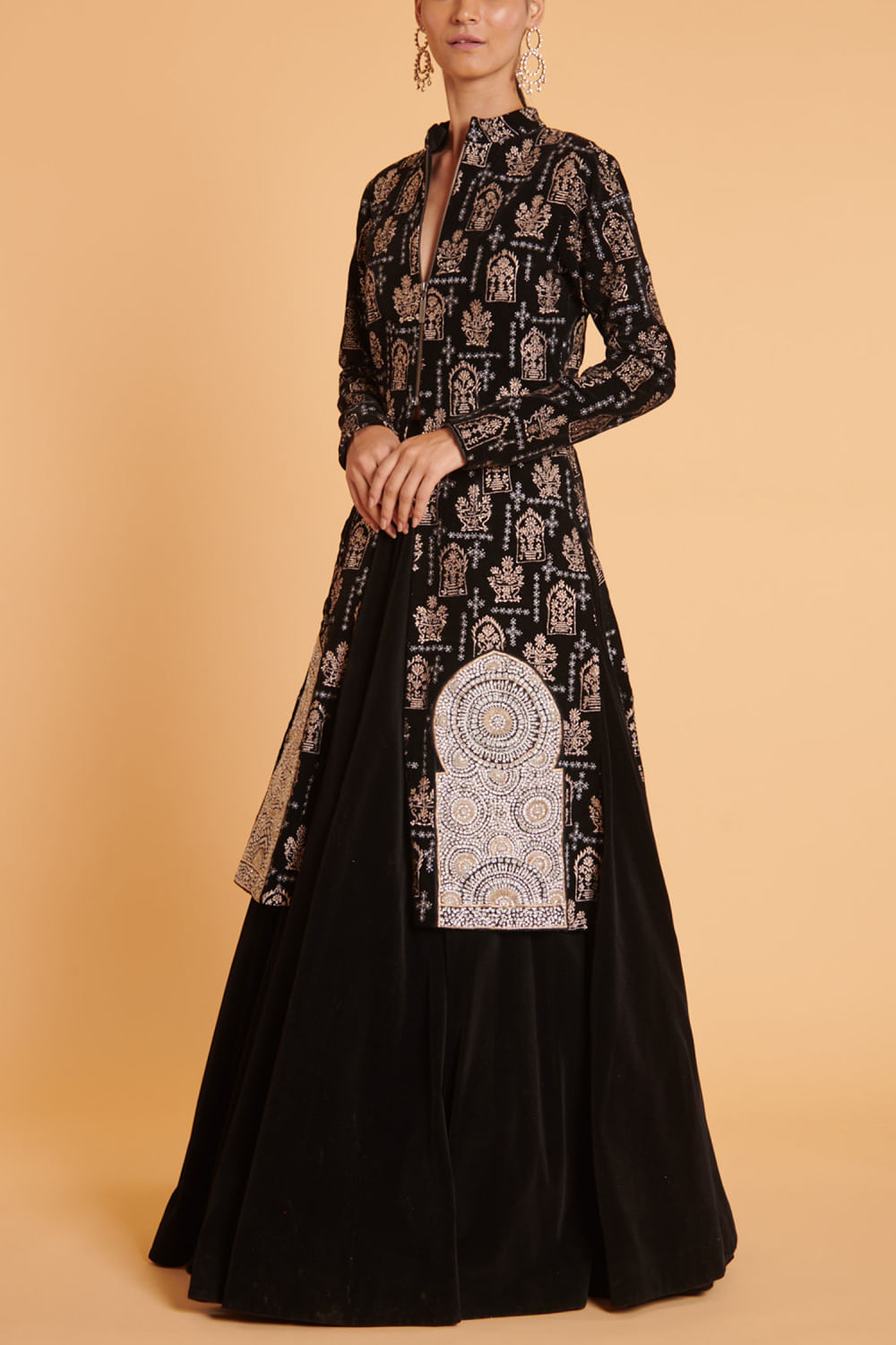 Siddartha Tytler designs this statement-making sherwani in velvet encapsulated with crystal embellishments, patchwork and metallic thread embroidery in floral and circular patterns, teaming it with a matching skirt. Style the look with embellished chandbalis and wedges.