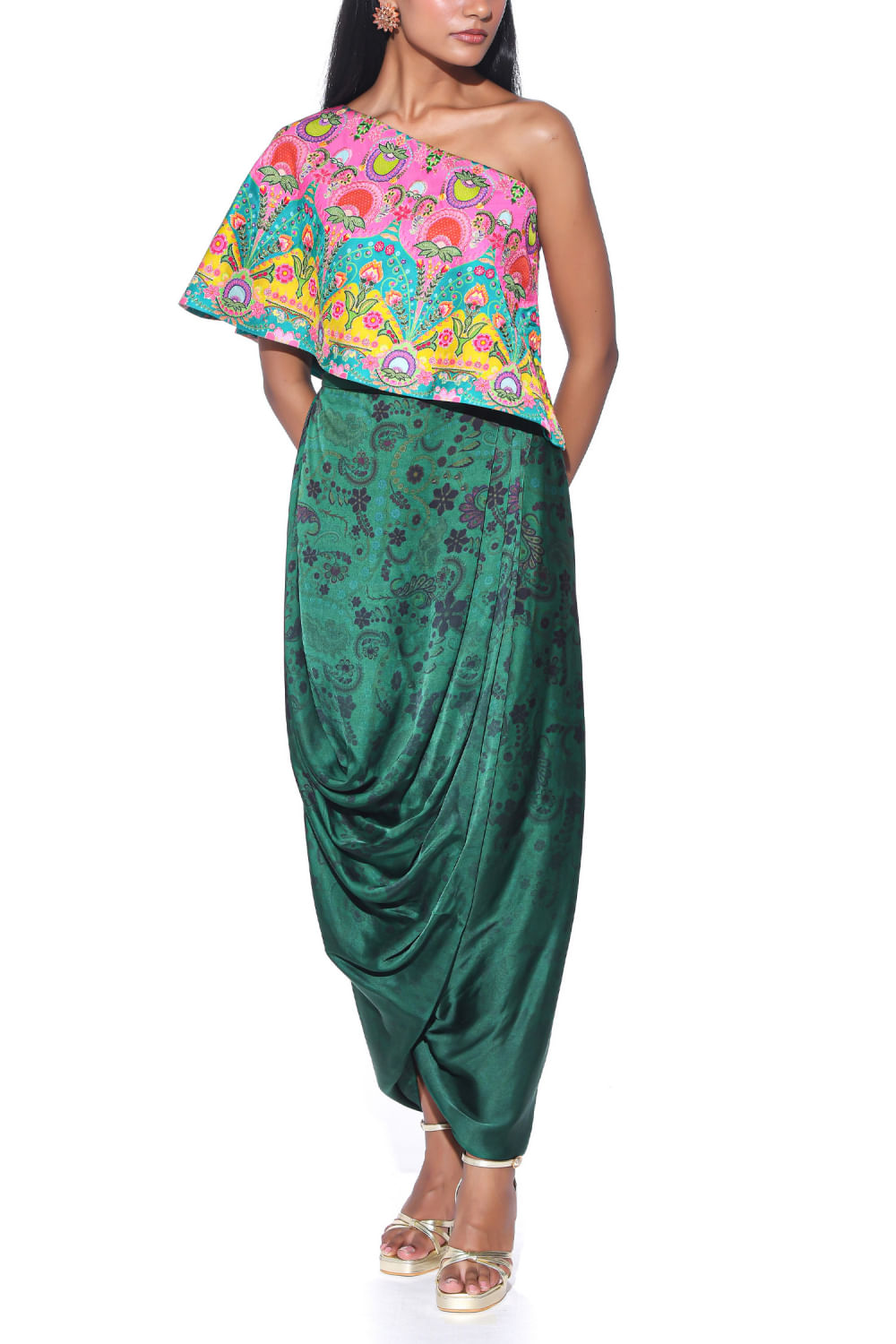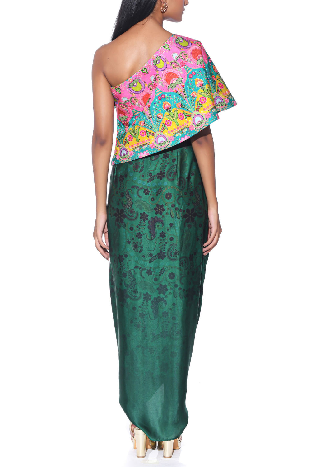 Siddhartha Bansal designs a pink and teal embroidered one-shoulder top paired seamlessly with a bottle green self-paisley printed drape skirt. Pair the look with a beaded jewellery and clutch bag.
