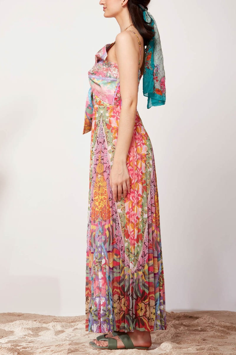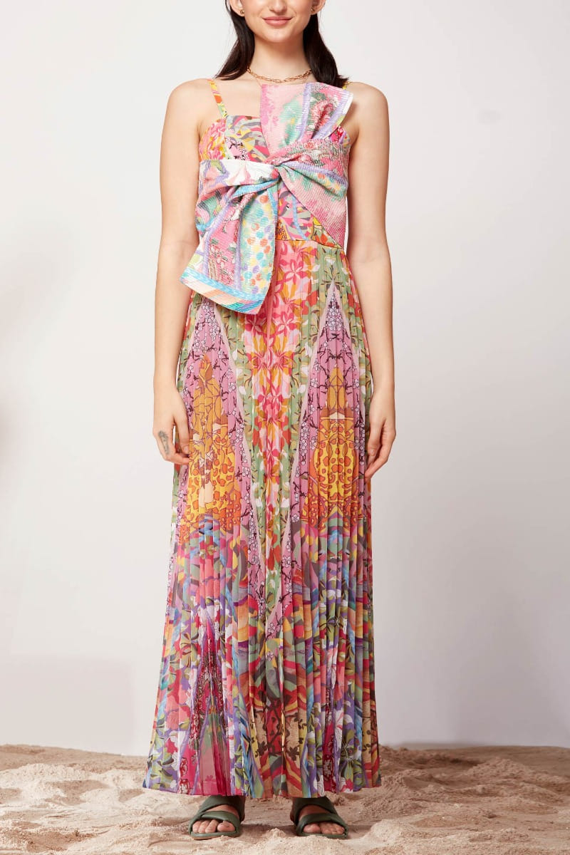 Siddhartha Bansal designs this chic sun dress with a pleated texture featuring a mix of artsy colourful prints and a big bow to make a statement. Style the look with studded hoops and colourful stackable bracelets.