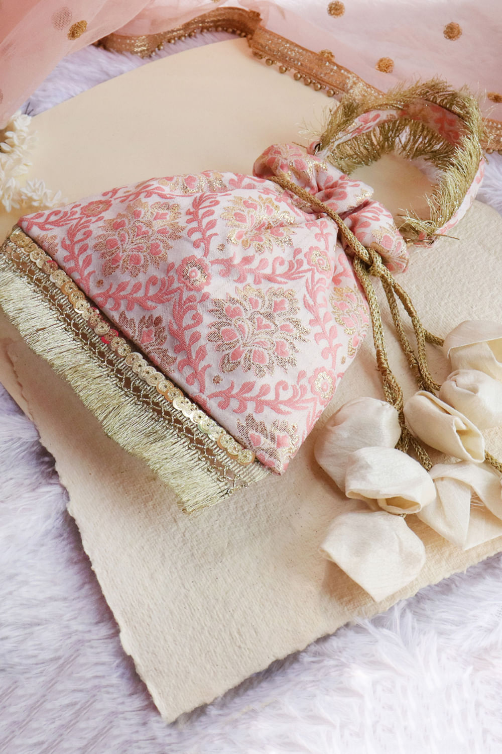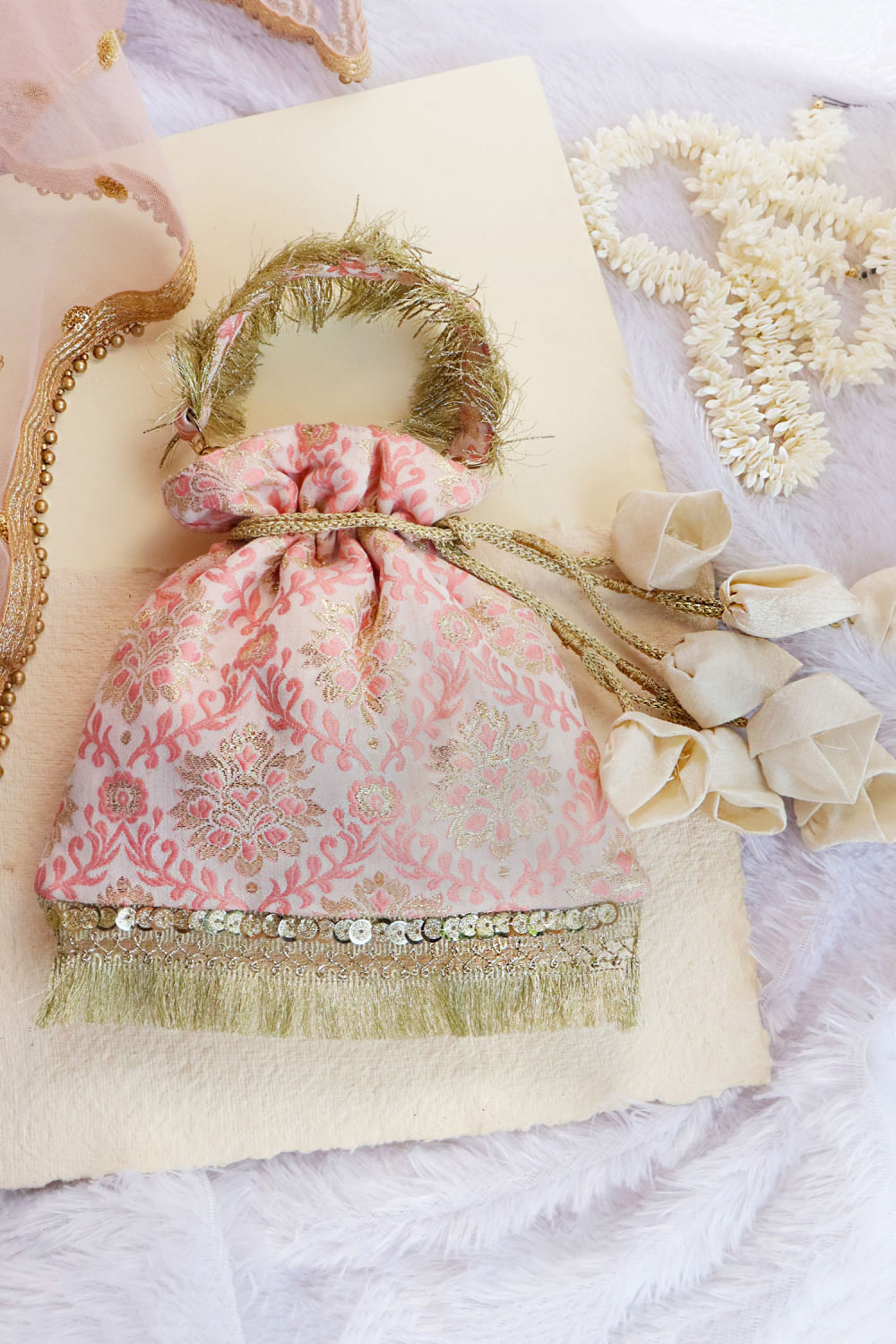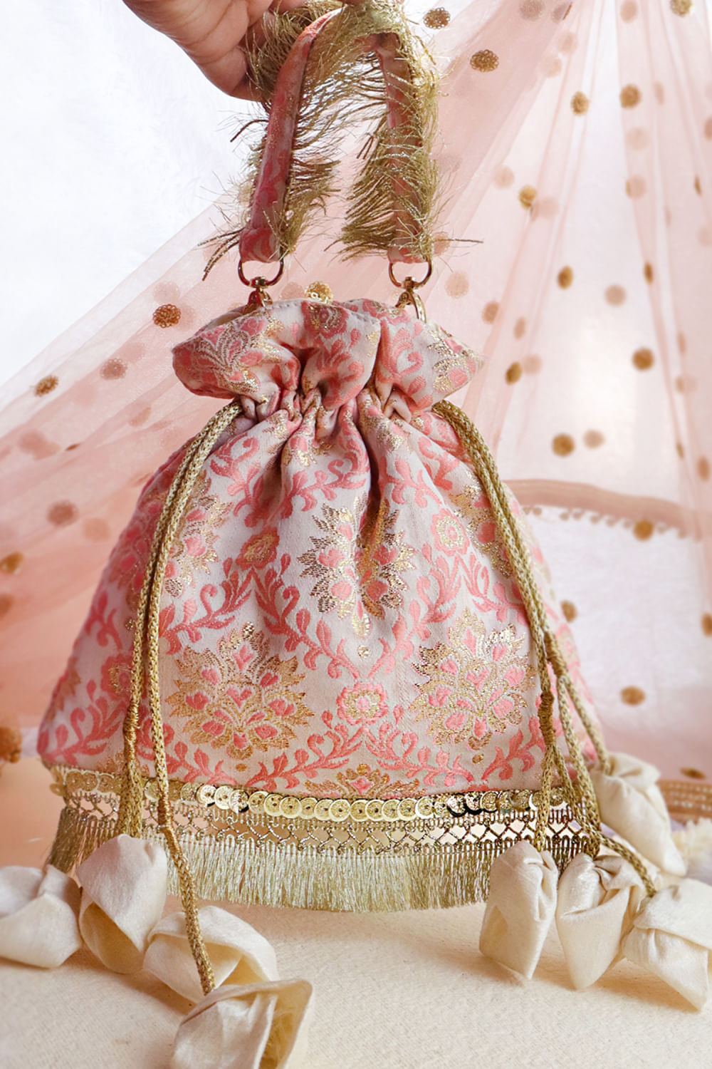 Soho Boho Studio designs this old world-charm potli bag woven in Banarasi silk with lace embellishment detailing featuring tulip tassels accent. Style it with a brocade saree for the event.