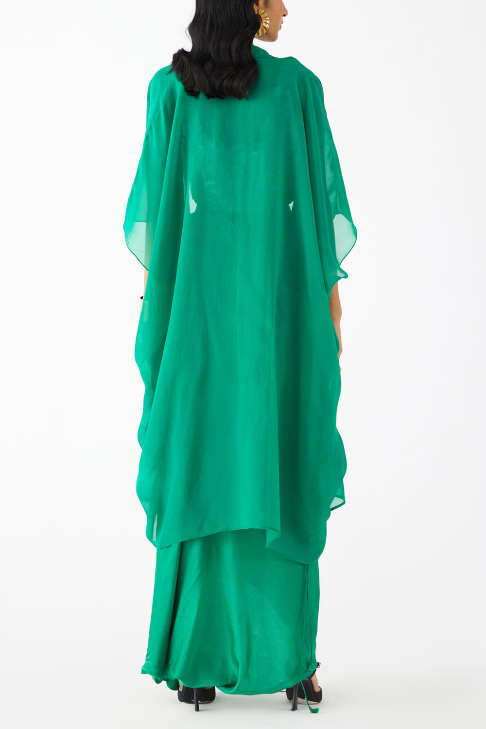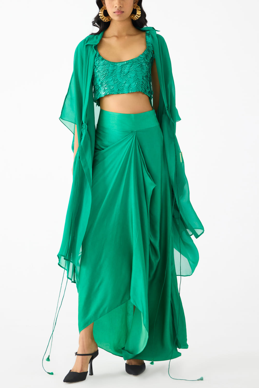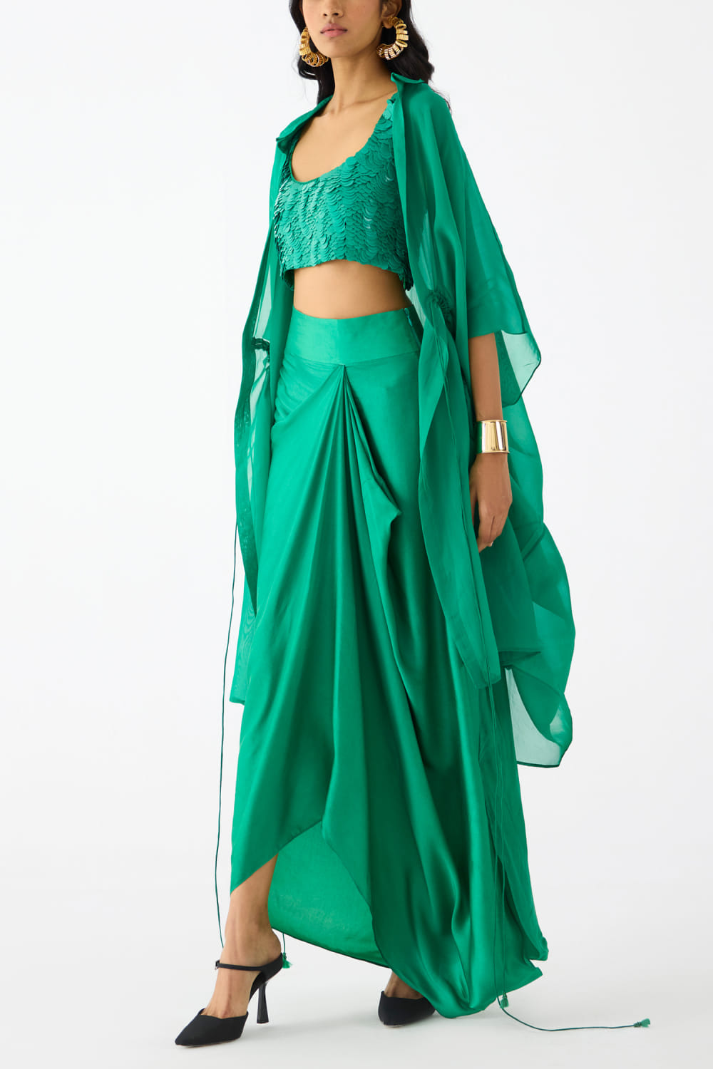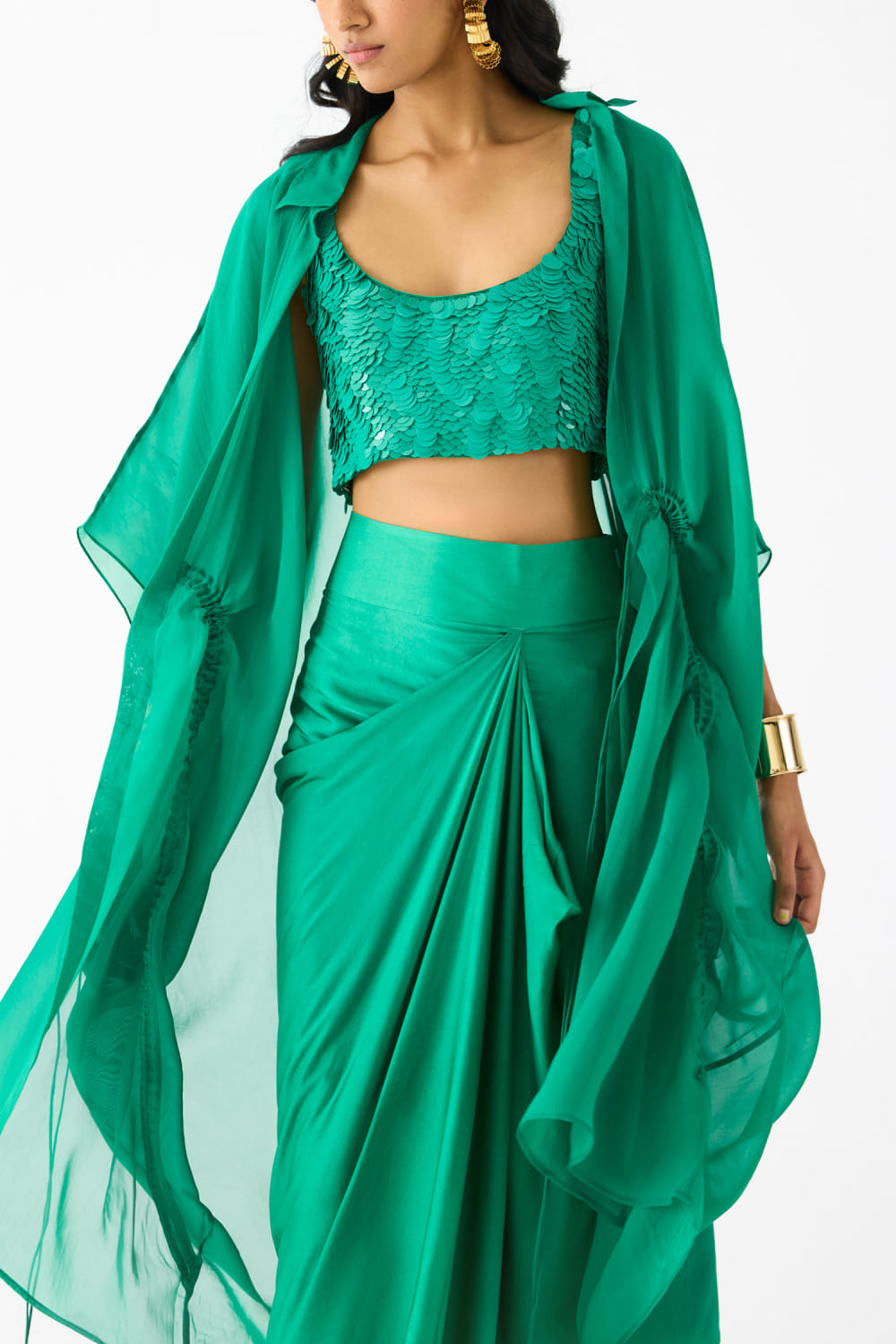 Studio Rigu designs this vibrant cape hand-dyed in organza with ruched and drawstring tie-up detailing. Style it with a bustier and palazzo for an occasion. The top and skirt here are shown for styling purposes only.