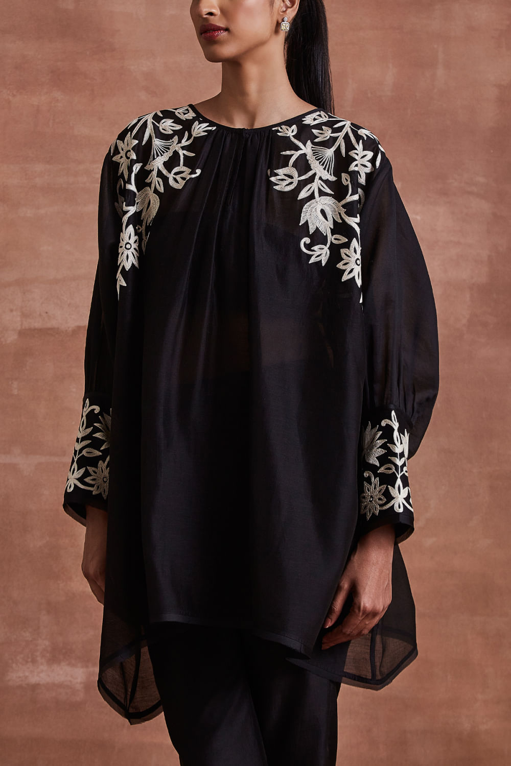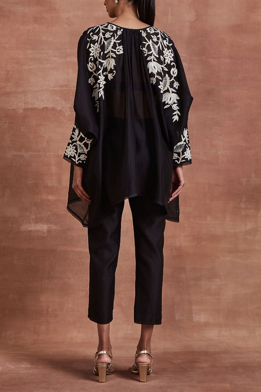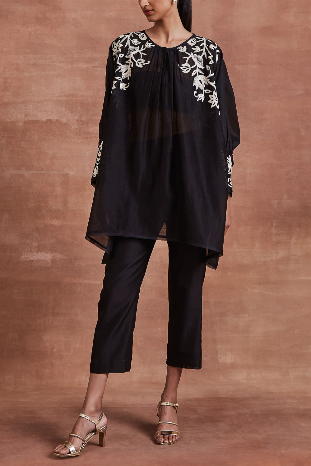 Sue Mue designs this charming kaftan-style top handwoven in chanderi silk with gathers, an asymmetric hem and silk thread aari placement embroidery detailing featuring a loose fit silhouette, completing it with an inner and pants. Style the look with a handbag and stilettoes for a statement look.