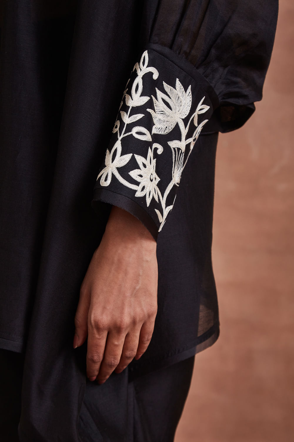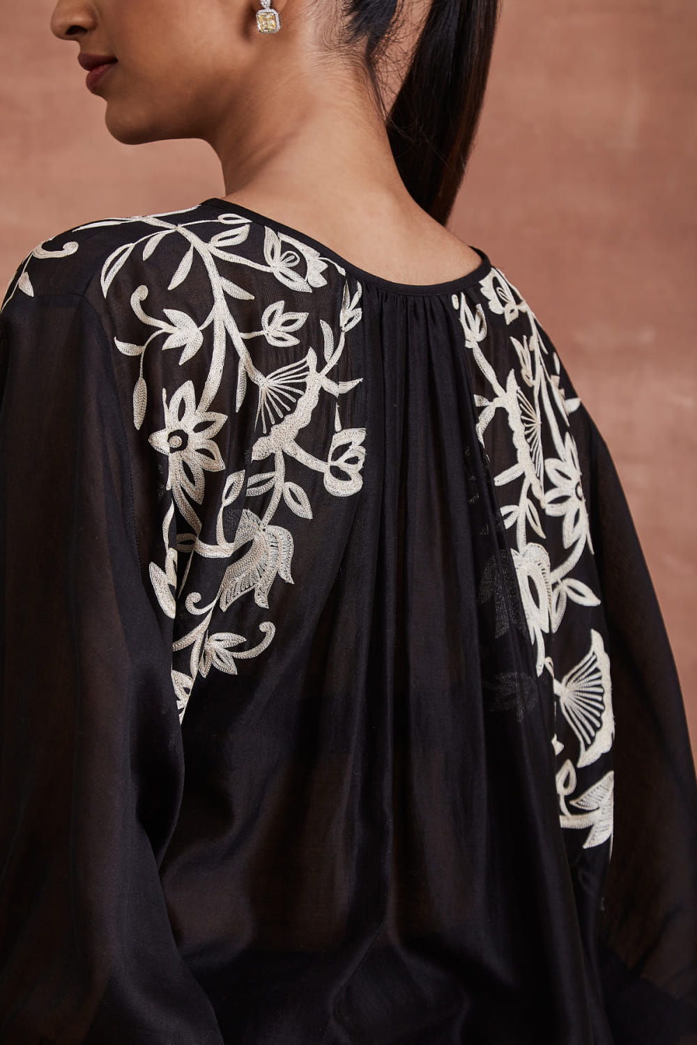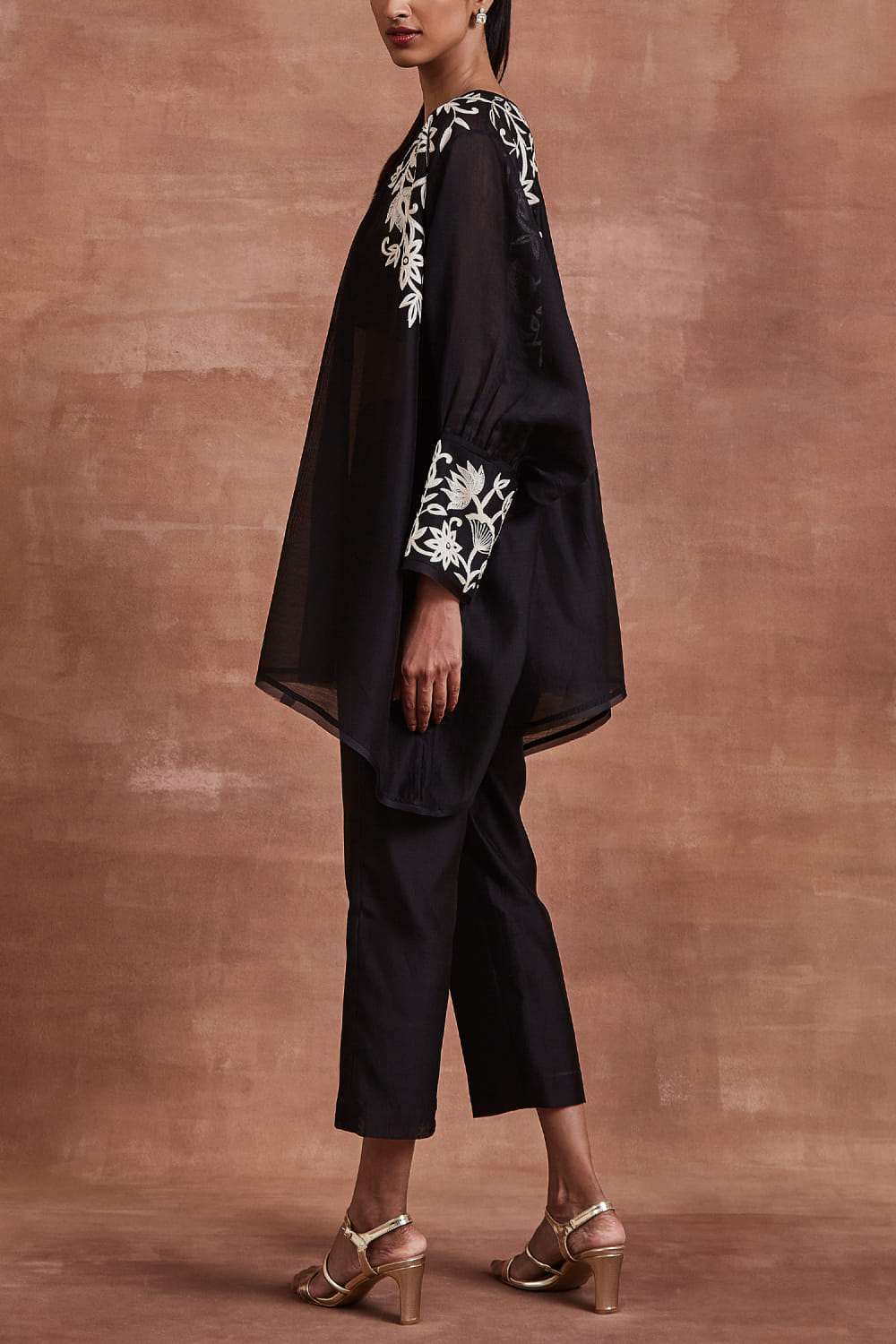 Sue Mue designs this charming kaftan-style top handwoven in chanderi silk with gathers, an asymmetric hem and silk thread aari placement embroidery detailing featuring a loose fit silhouette, completing it with an inner and pants. Style the look with a handbag and stilettoes for a statement look.