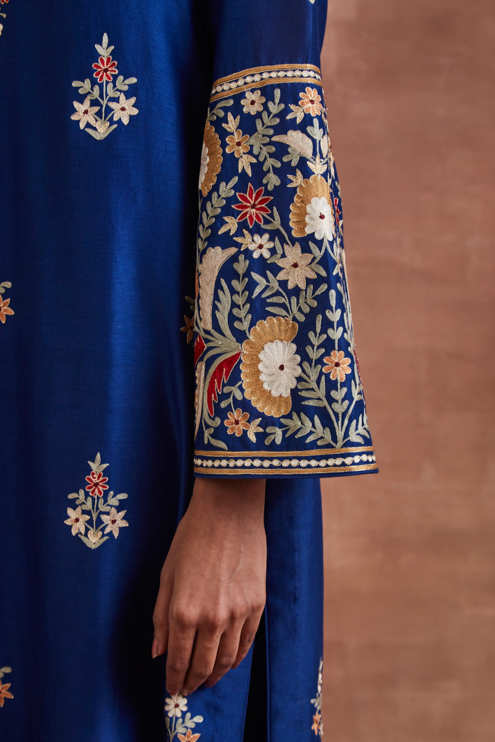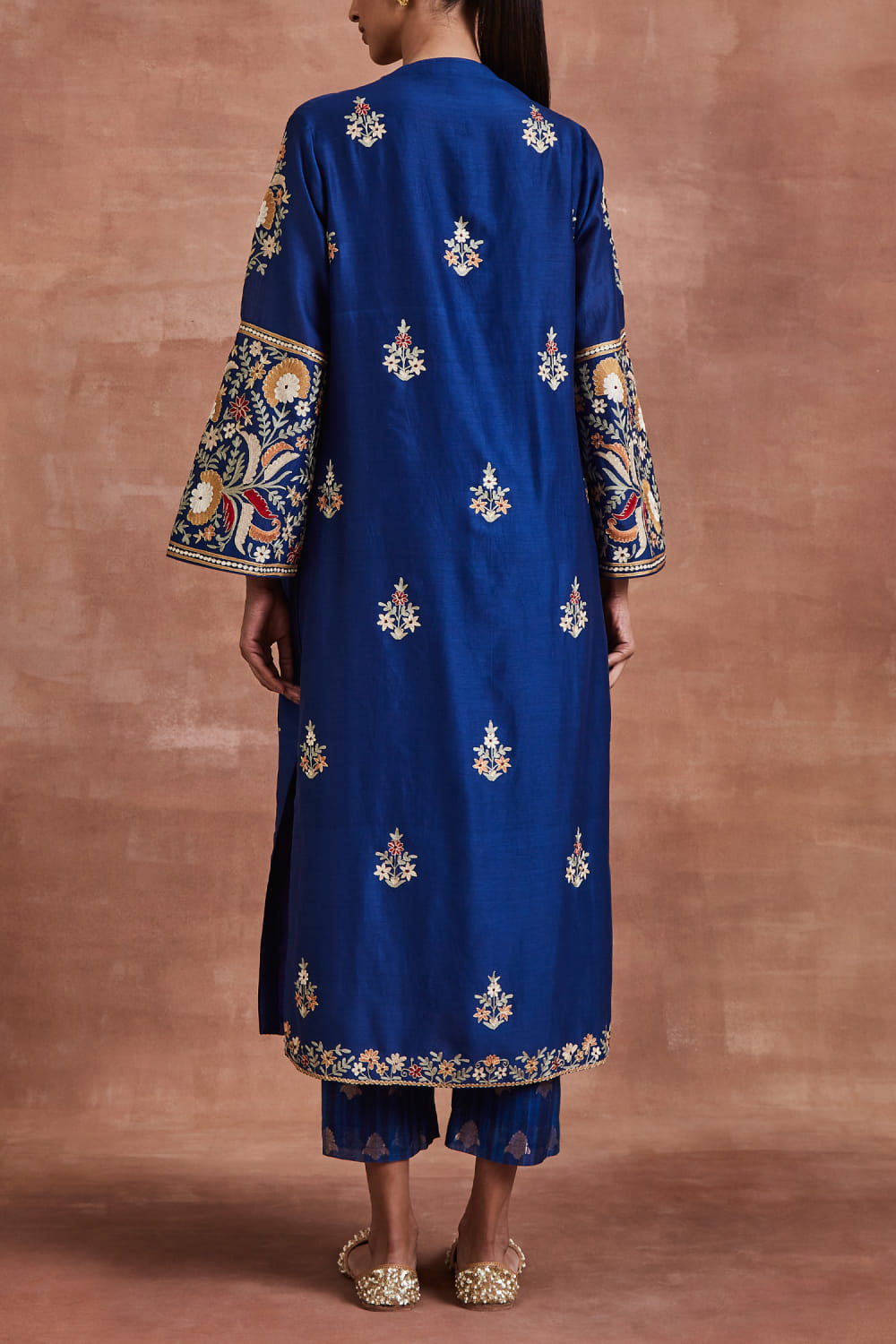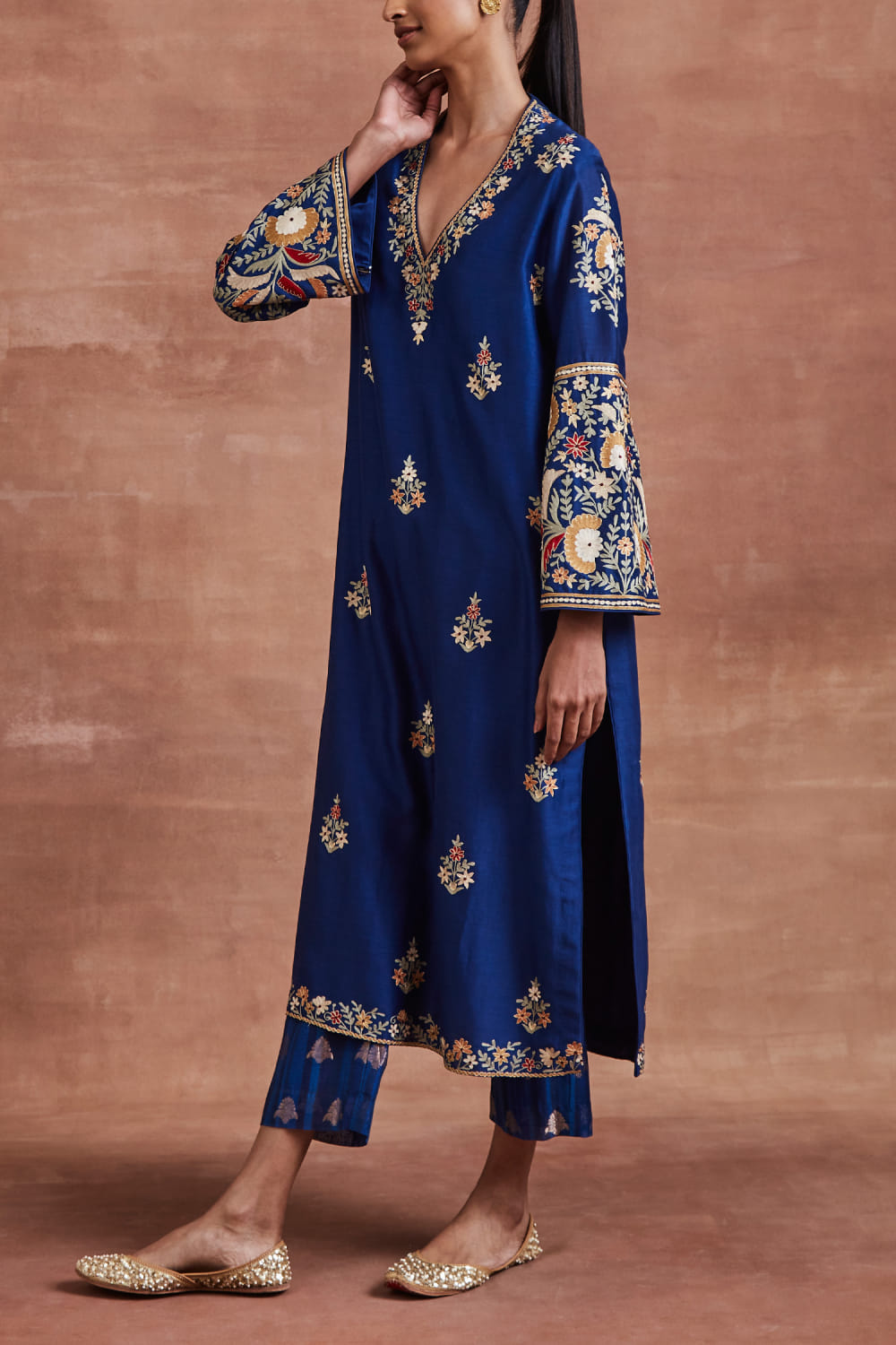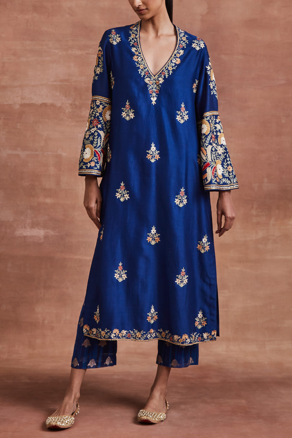 Sue Mue designs this mesmerising kurta handwoven in chanderi silk with aari and zari embroidery detailing in floral motifs and patterns, teaming it with matching banarasi pants and matching striped scalloped tissue dupatta. Style the look with a cubic zirconia necklace set and block heels.