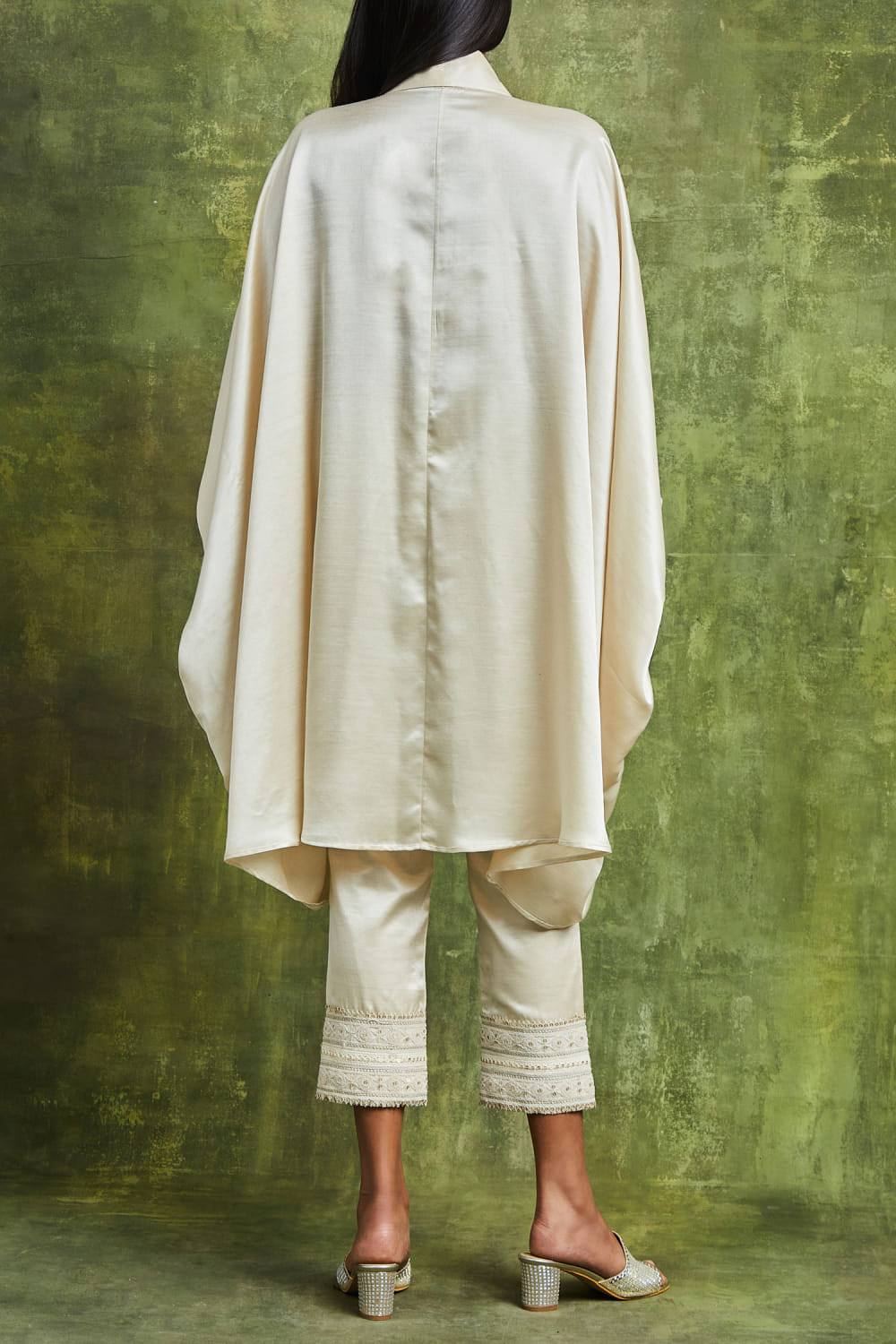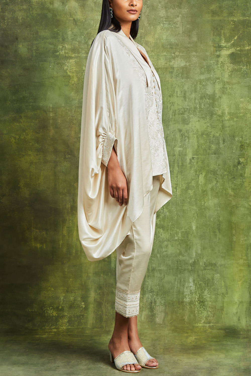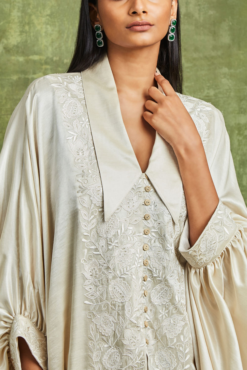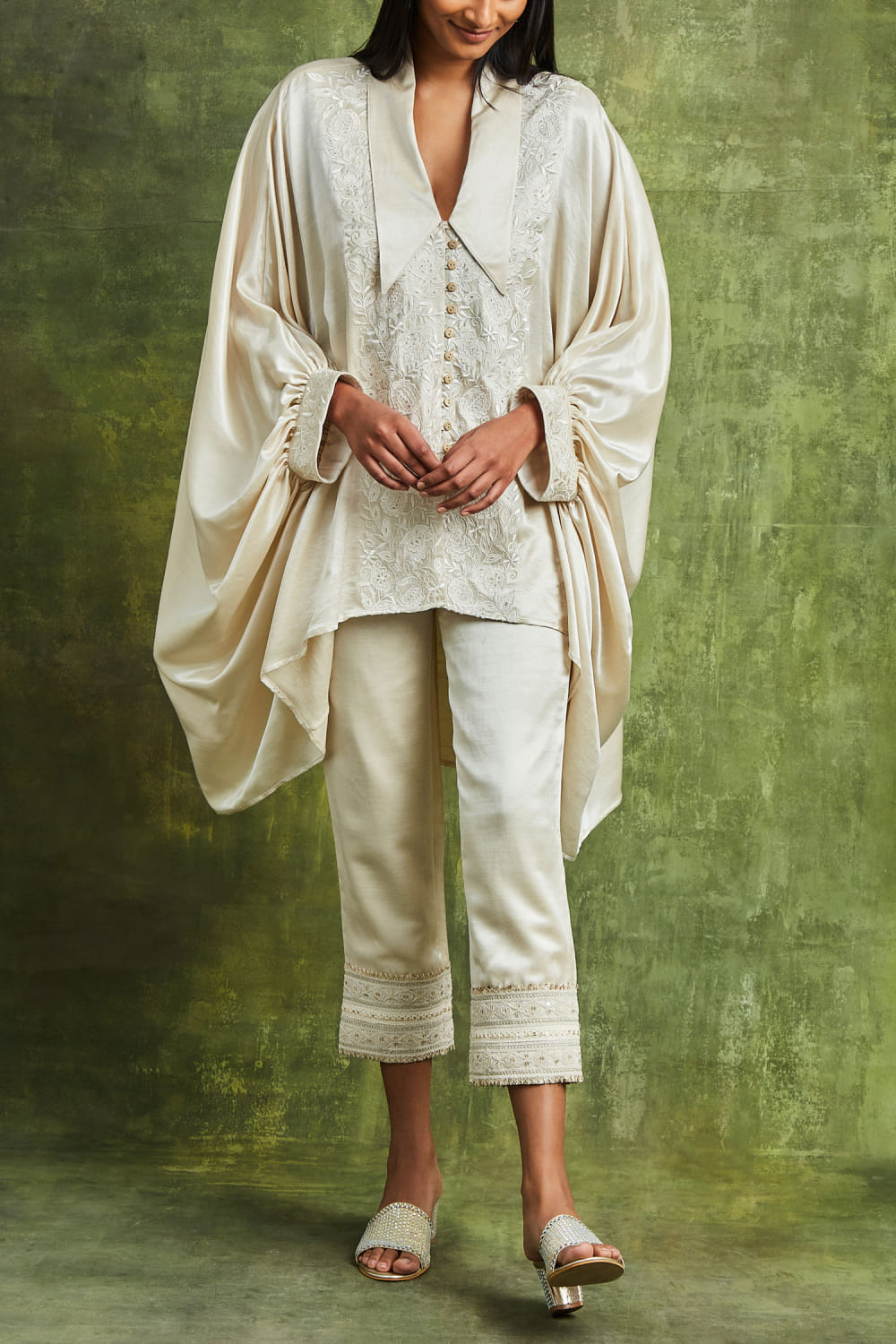 Sue Mue designs this contemporary shirt embraced in pure silk satin with resham thread embroidery in floral patterns featuring a loose asymmetrical silhouette, teaming it with matching embroidered pants. Style the look with a chain pendant and a multi-finger ring for a stylish update.