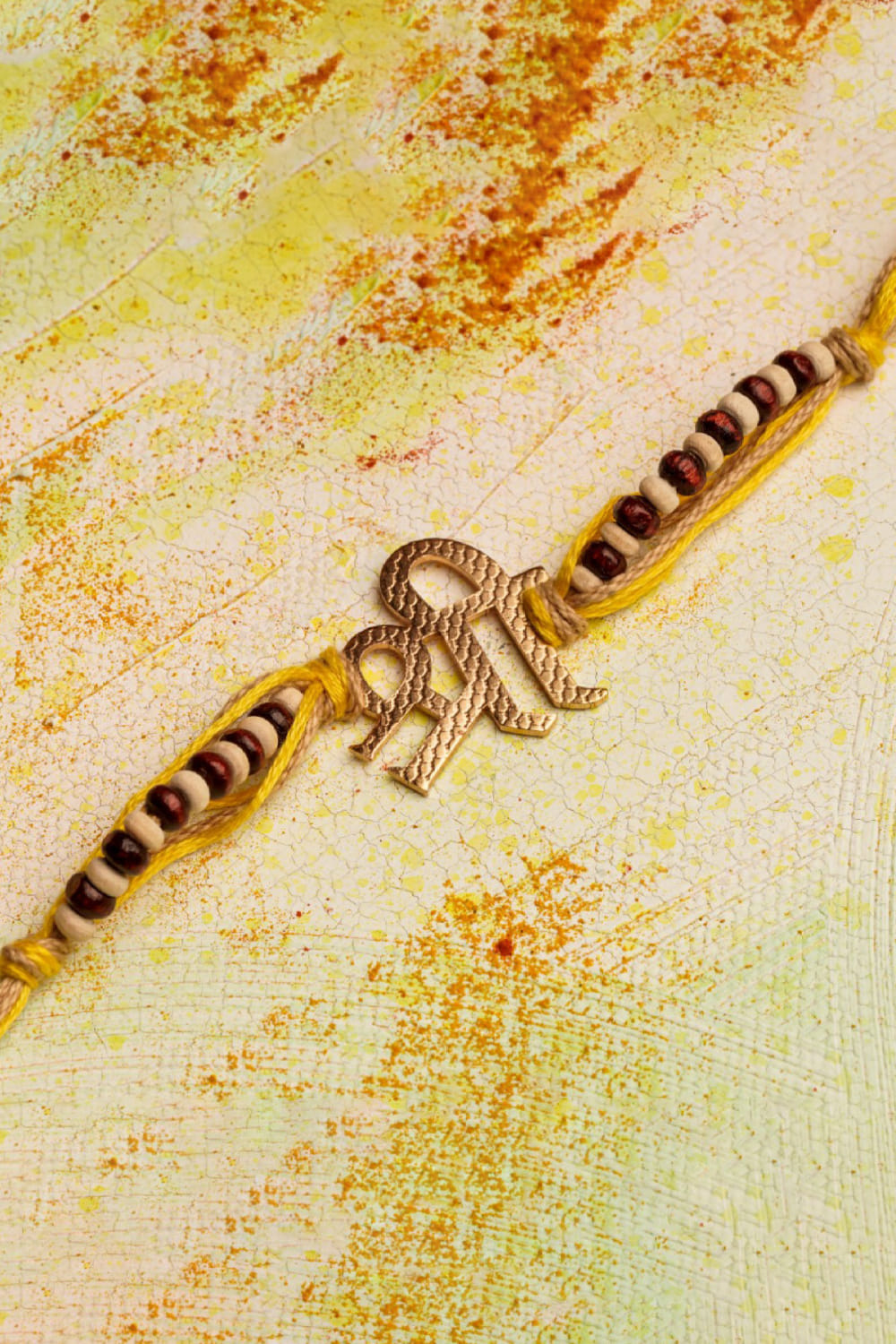 Suhani Pittie designs this eye-catching rakhi for your brother rendered in 22kt gold finish encapsulated with a Shree motif, chandan bead embellishments and yellow threads.