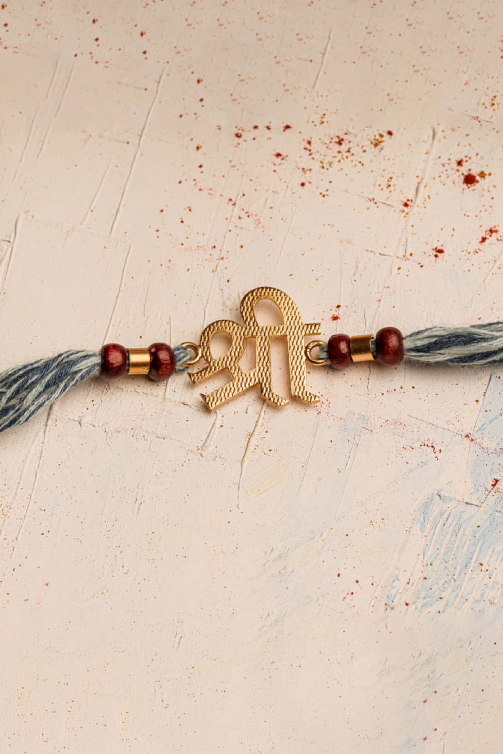 Suhani Pittie designs this charming rakhi for your brother crafted in 22kt gold plating with a Shree motif, denim threads, scrolls and chandan beads, a brilliant choice for the celebration.