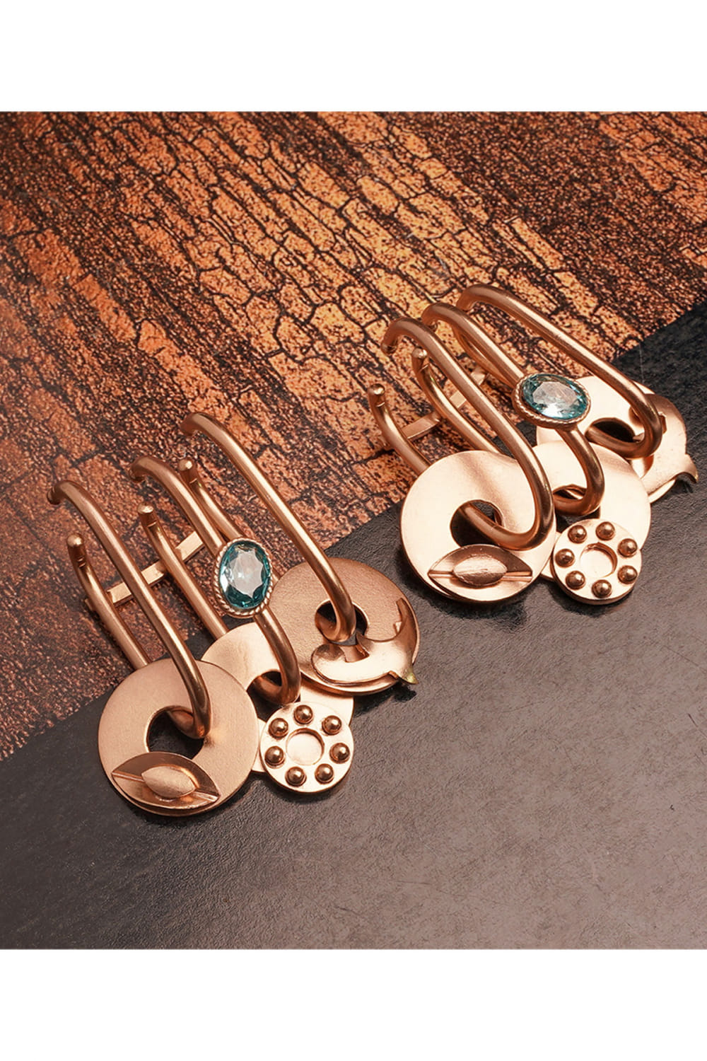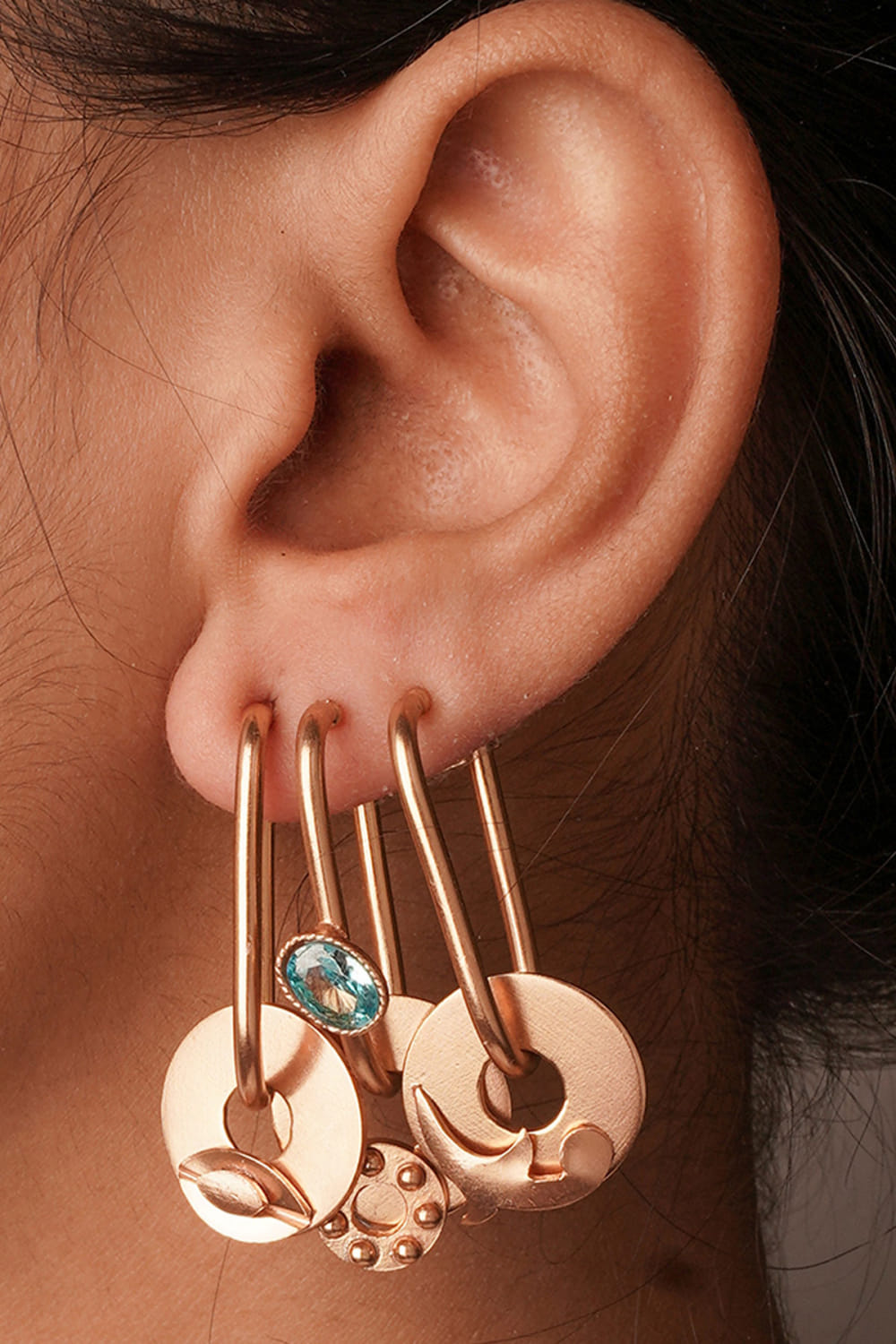 Suhani Pittie designs this captivating pair of ear cuffs rendered in 22kt gold-plated copper studded with crystal embellishments in disc shapes. Style them with a jacket set for a statement appeal.