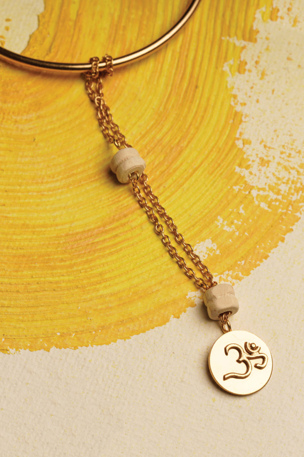 Suhani Pittie designs this magnificent lumba rakhi for your sister-in-law embraced in a 22kt gold plating enriched with an Om motif on a disc, chain detailing and tulsi bead embellishments.