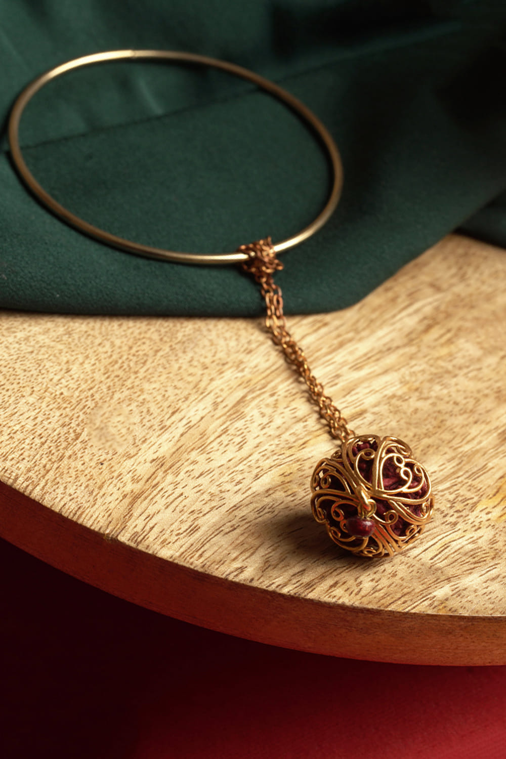 Suhani Pittie designs this ethereal lumba rakhi for your sister-in-law crafted in 22kt gold-plated copper enriched with a rudraksh bead featuring intricate carved detailing and a chain.