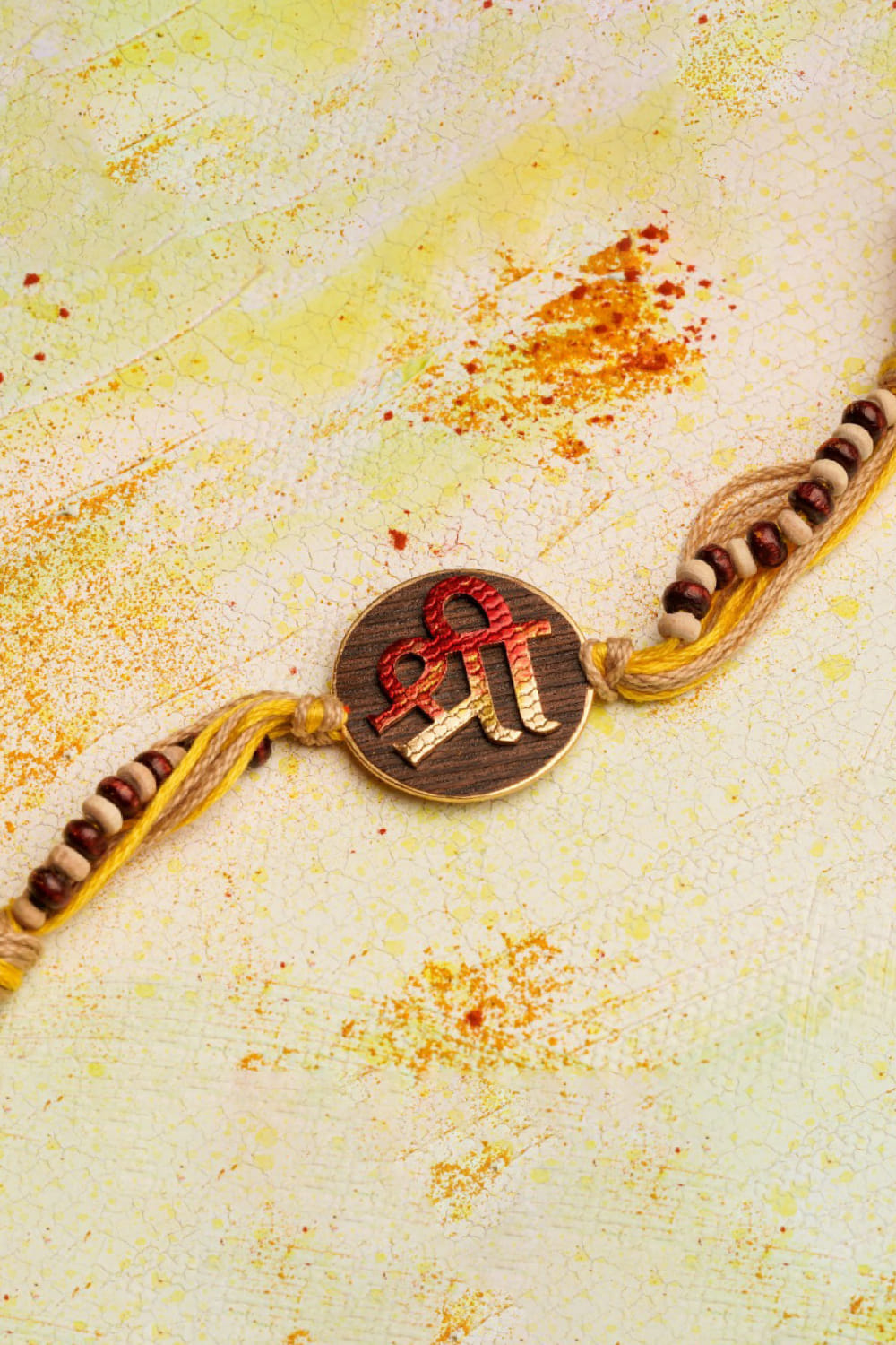 Suhani Pittie designs this stunning rakhi for your brother crafted in 22kt gold finish enriched with a hand painted Shree on wood featuring tulsi and chandan bead embellishments on jute thread.