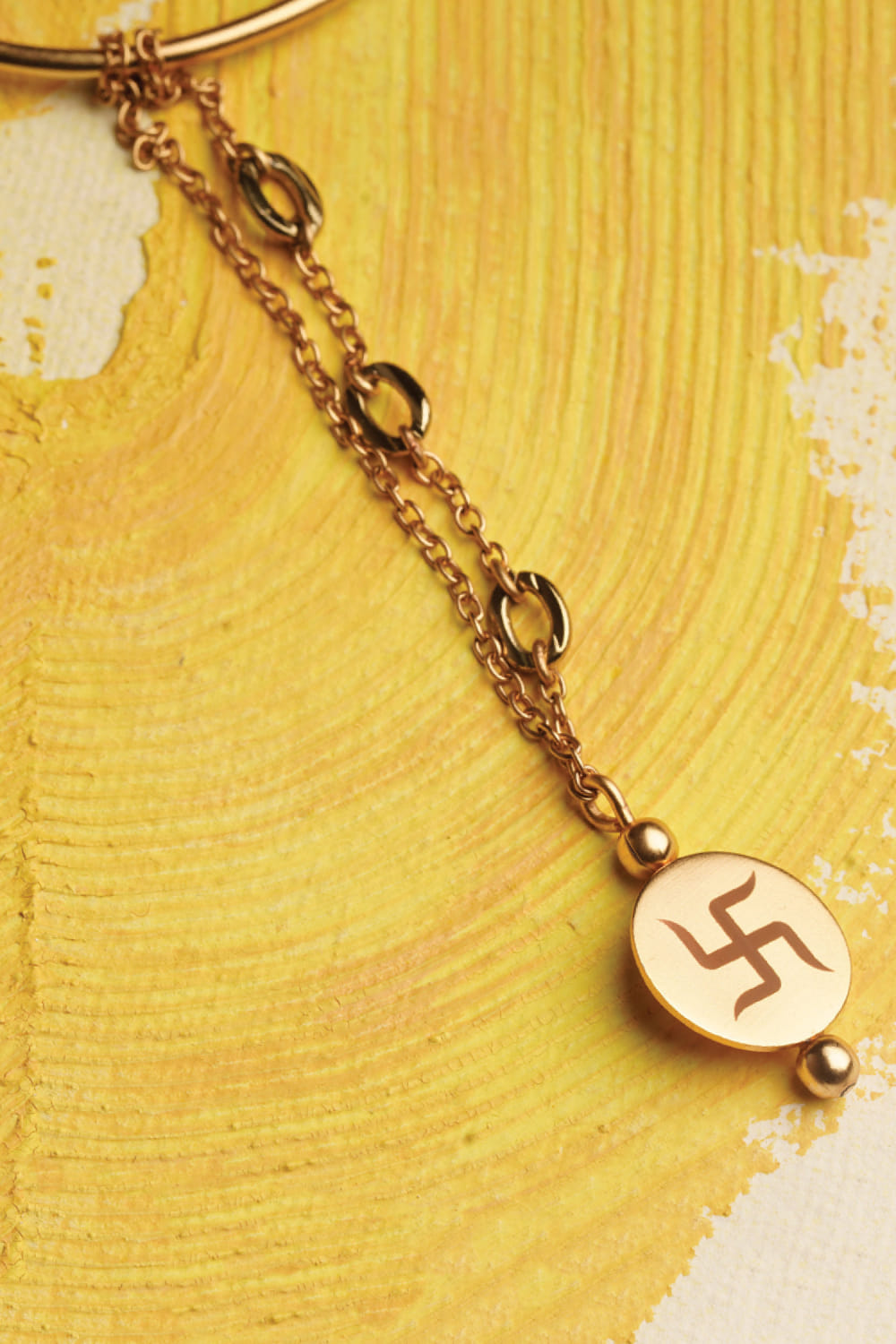 Suhani Pittie designs this ethereal lumba rakhi for your sister-in-law embraced in 22kt gold-finish enriched with a laser engraved Swastika on a disc featuring chain detailing and metallic beads.