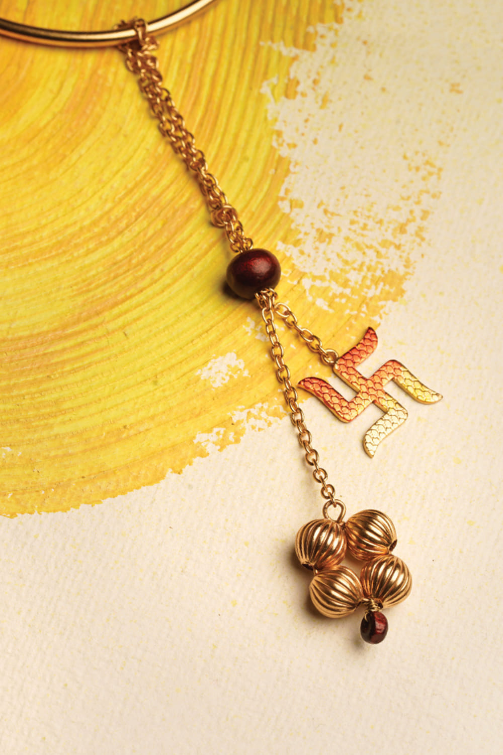 Suhani Pittie designs this spiritual lumba rakhi for your sister-in-law customised in a 22kt gold finish with a hand-painted and textured Swastika motif featuring chain detailing, chandan and metal bead embellishments.