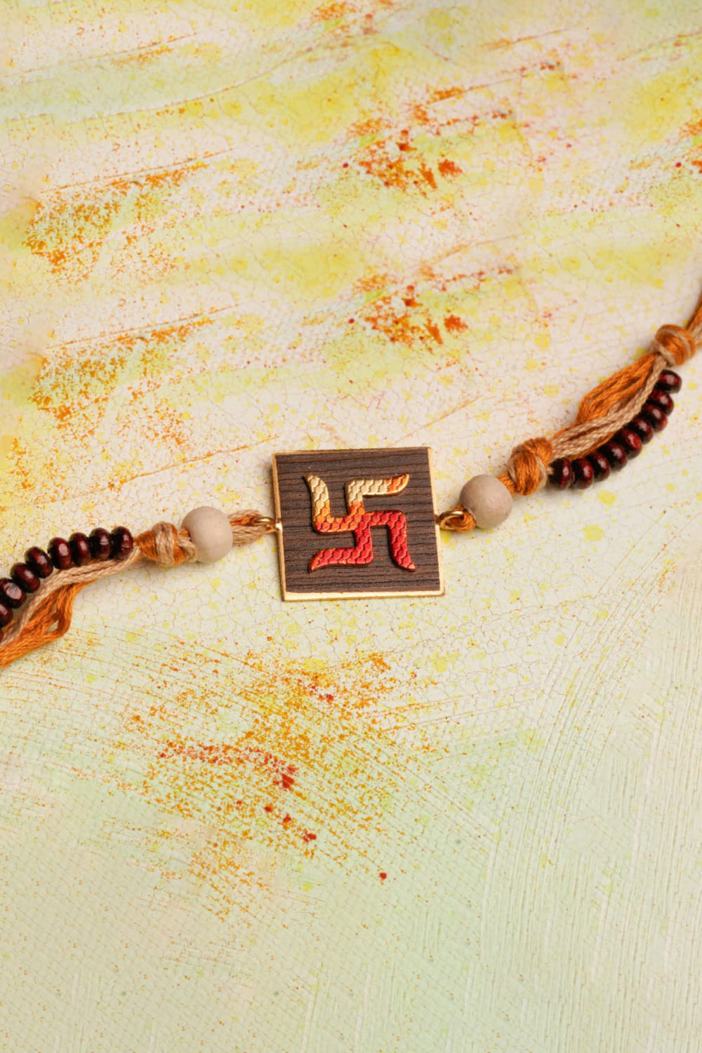 Suhani Pittie designs this gorgeous rakhi for your brother customised in 22kt gold finish encapsulated with a hand painted Swastika on wood featuring chandan bead embellishments on jute thread.