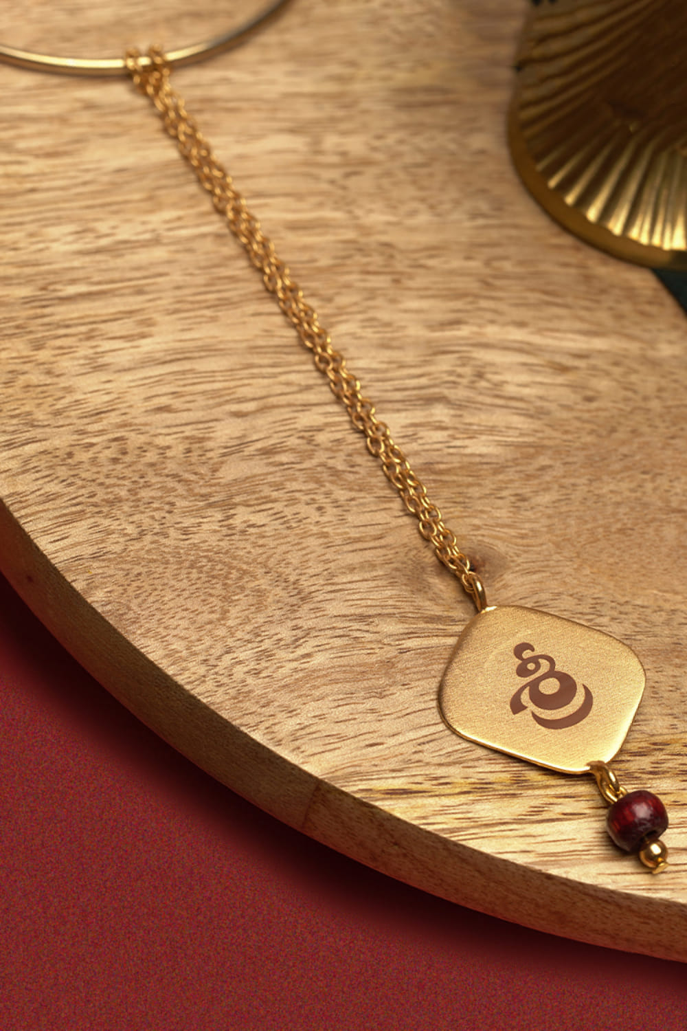 Suhani Pittie designs this traditional rakhi for your sister-in-law crafted in 22kt gold-plated metal alloy adorned with a laser engraved Telugu Shree motif featuring chandan bead embellishments and chain detailing.