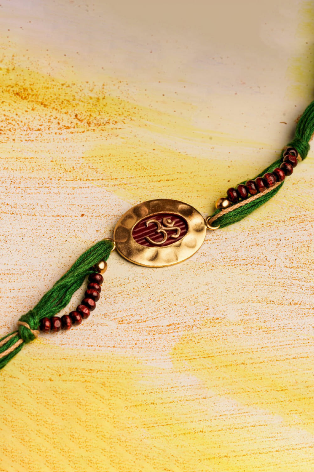 Suhani Pittie designs this vivid rakhi for your brother embraced in 22kt gold plating with an Om motif on an oval charm, green threads and chandan bead embellishments.