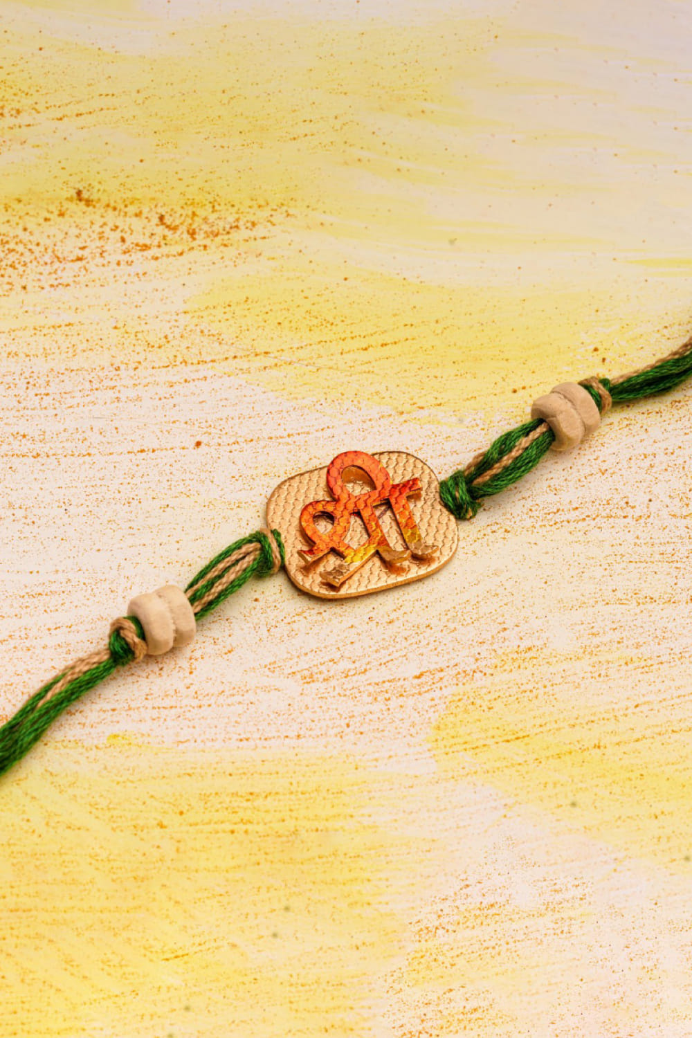 Suhani Pittie designs this stunning rakhi customised in a 22kt gold finish with texture detailing, a hand-painted Shree motif on a rounded-square shape, green threads and tulsi bead embellishments.