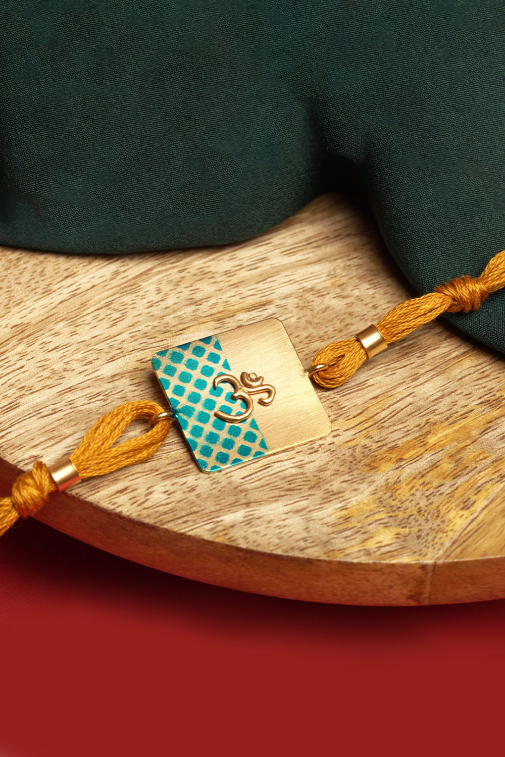 Suhani Pittie designs this enchanting rakhi for your brother rendered in a 22kt gold-plated metal alloy adorned with an Om motif on a hand-painted square shape featuring mustard threads.