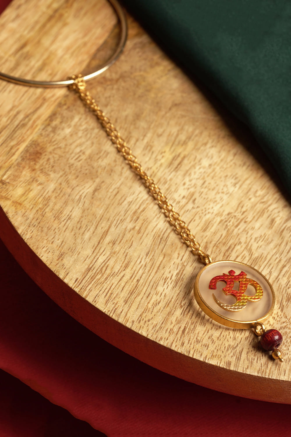 Suhani Pittie designs this magnificent lumba rakhi for your sister-in-law embraced in a 22kt gold-finish laden with a hand painted Om motif on acrylic featuring chandan bead embellishments and chain detailing.