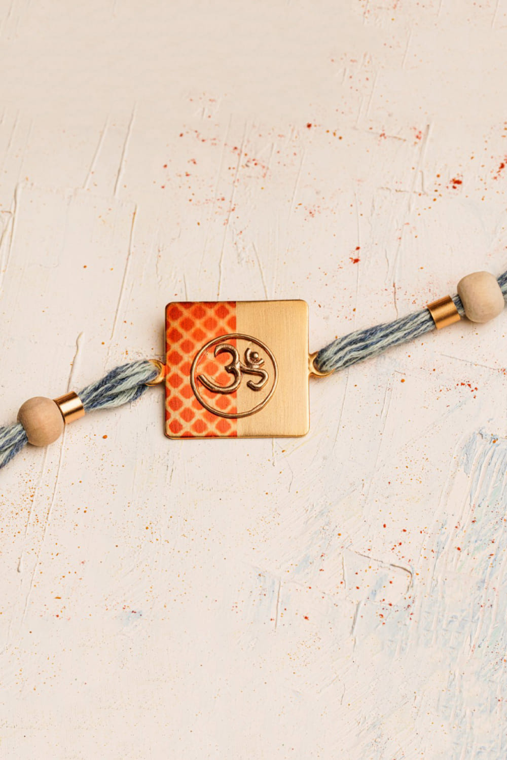 Suhani Pittie designs this exquisite rakhi for your brother embraced in 22kt gold finish laden with an Om motif on a hand painted square shape featuring scrolls and Tulsi bead embellishments on denim threads.