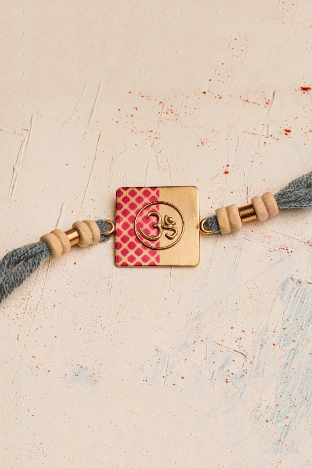 Suhani Pittie designs this charming rakhi for your brother crafted in 22kt gold finish adorned with an Om motif on a hand painted square shape featuring scrolls and Tulsi bead embellishments on threads.